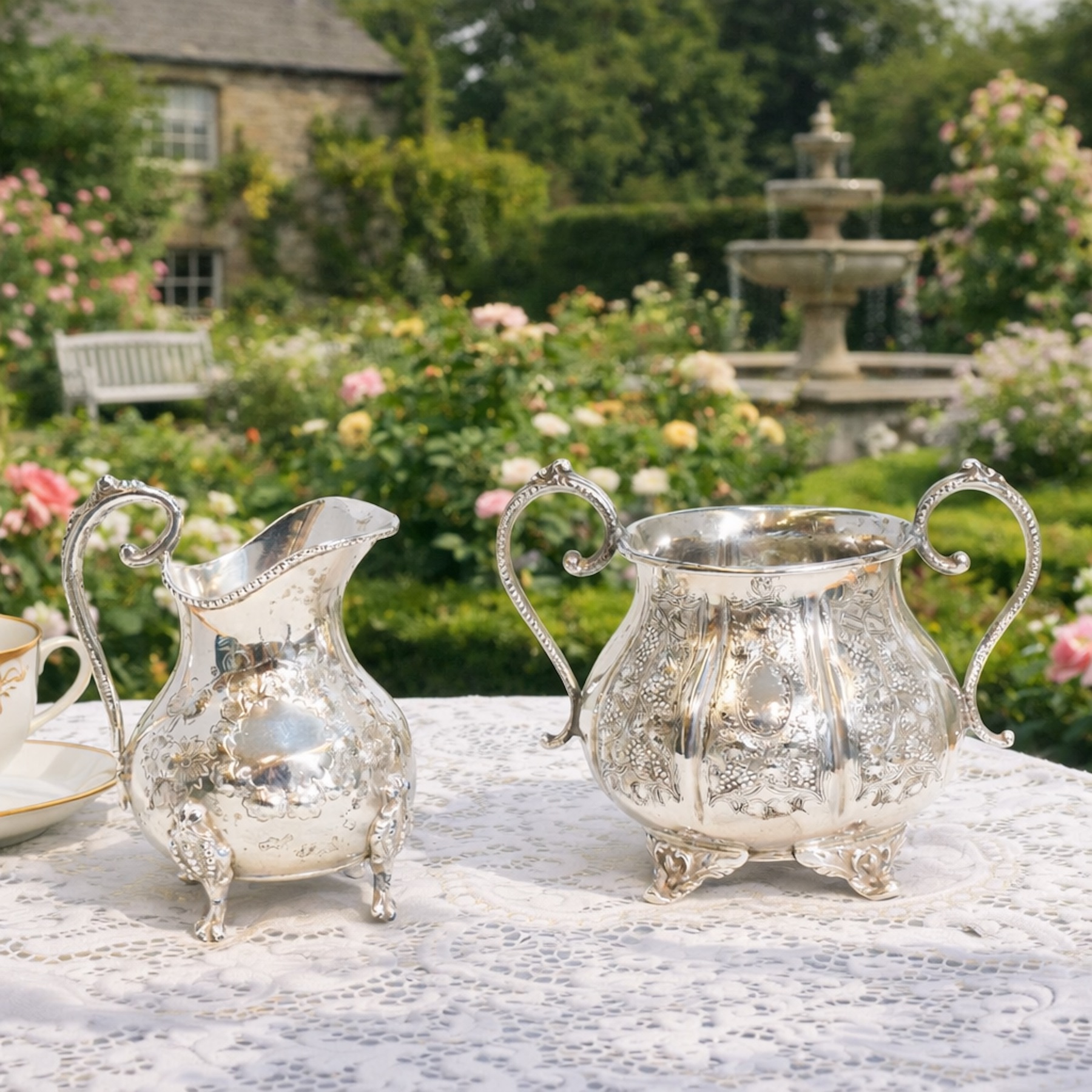 Antique English silver-plated handled bowl and creamer
