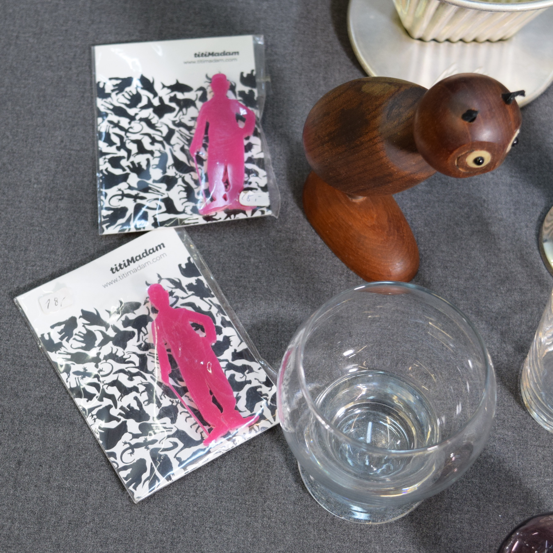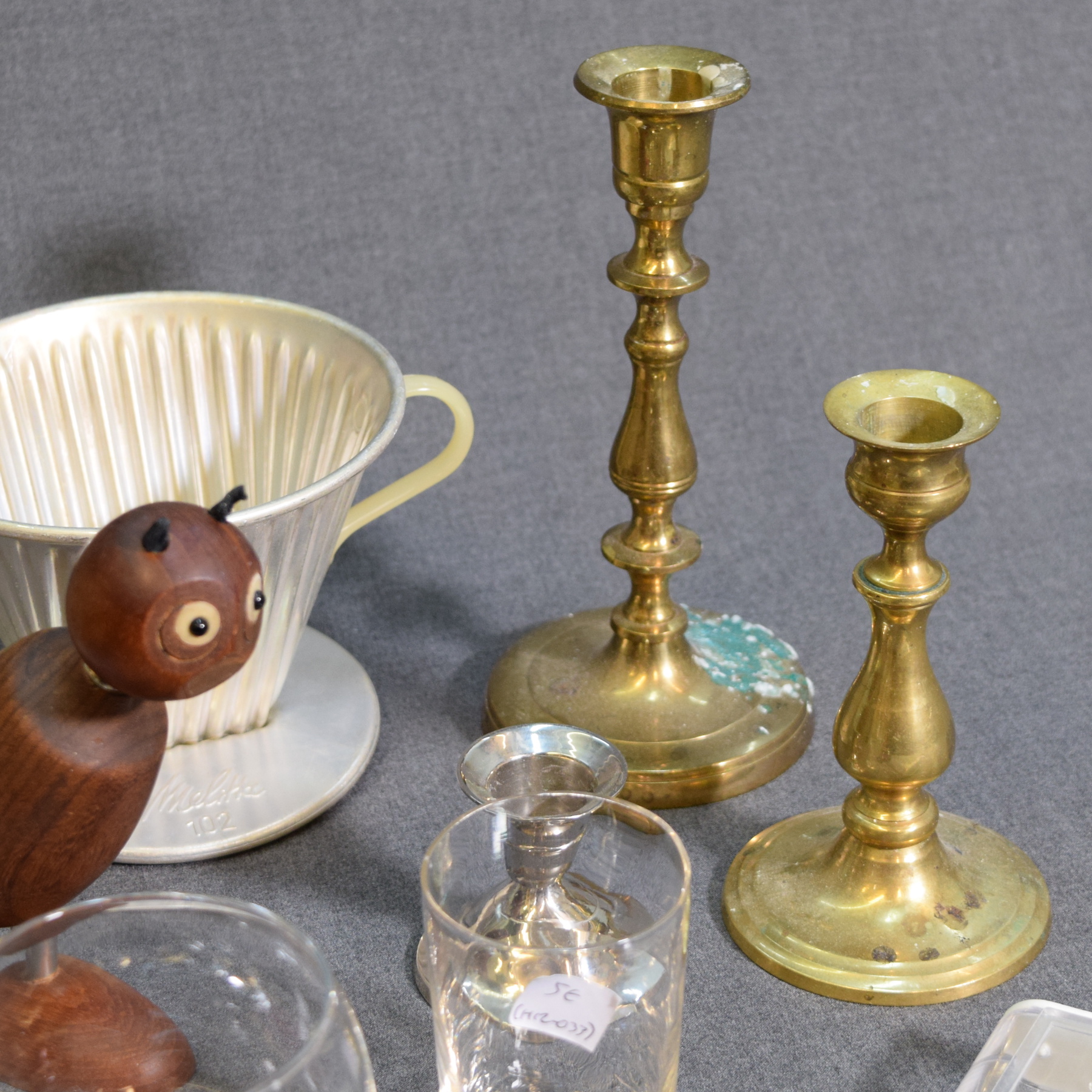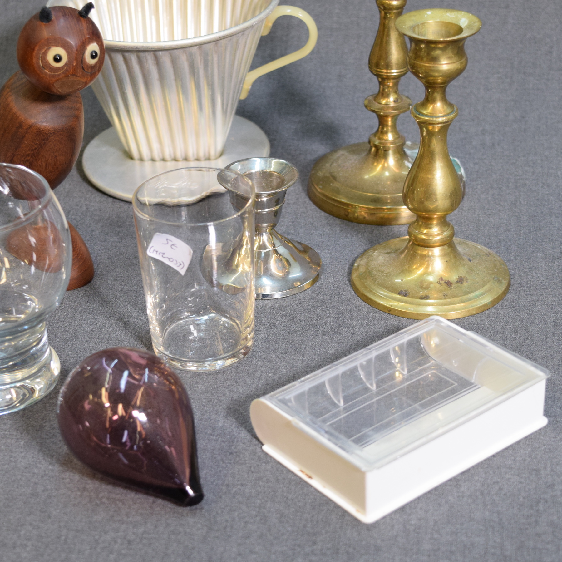 2 "Kulkuri" brooches, Melitta 102 coffee filter, bottle/wine bottle opener, 2 glasses, teardrop-shaped glass ball, low candle holder, 2 brass candle holders, and a plastic case for playing cards.