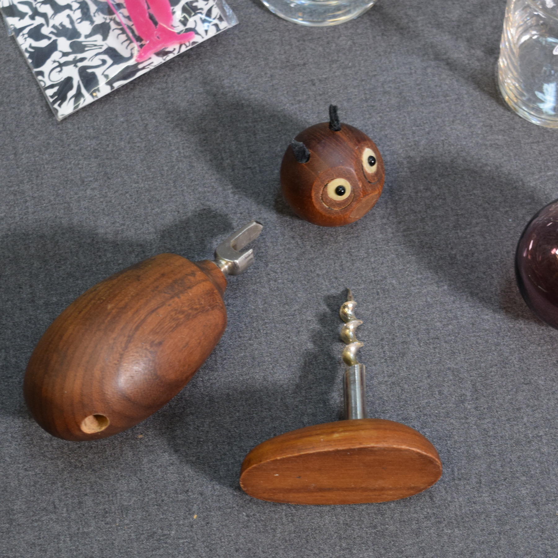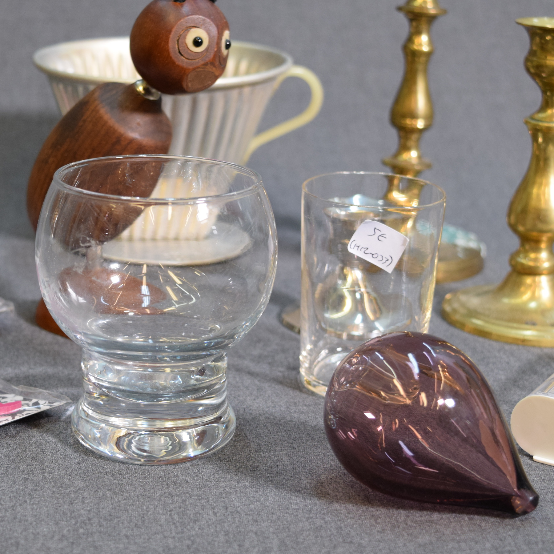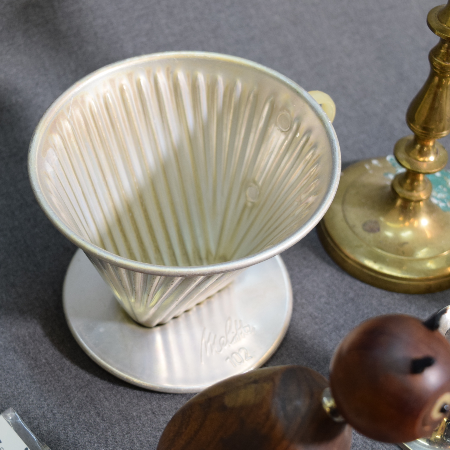 2 "Kulkuri" brooches, Melitta 102 coffee filter, bottle/wine bottle opener, 2 glasses, teardrop-shaped glass ball, low candle holder, 2 brass candle holders, and a plastic case for playing cards.