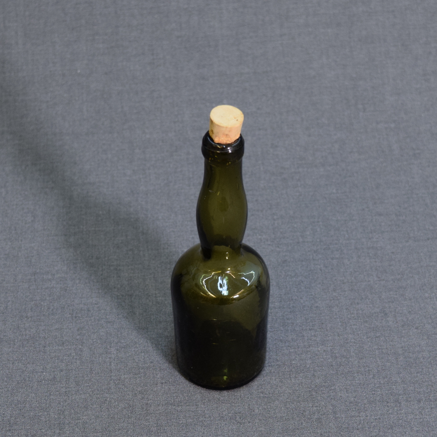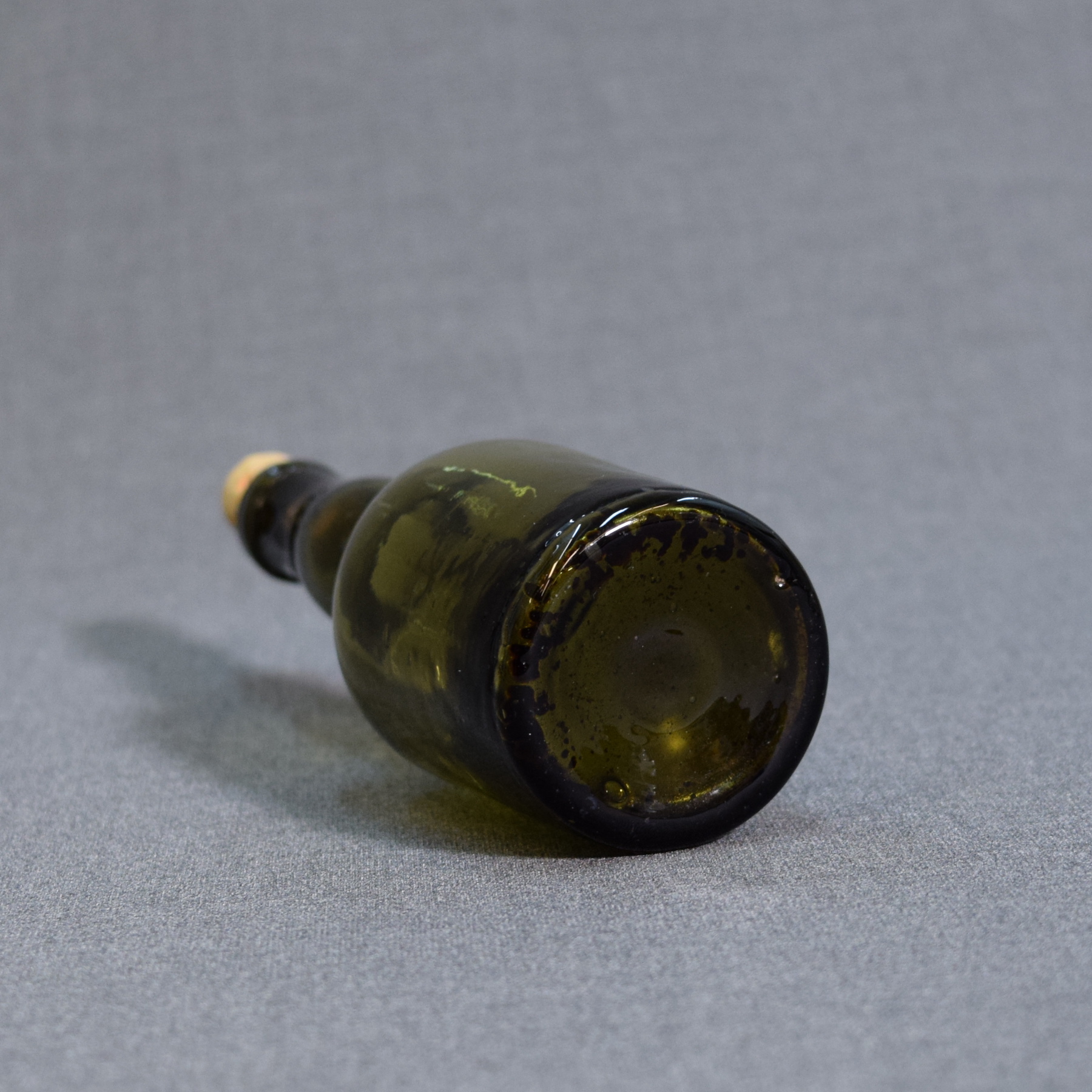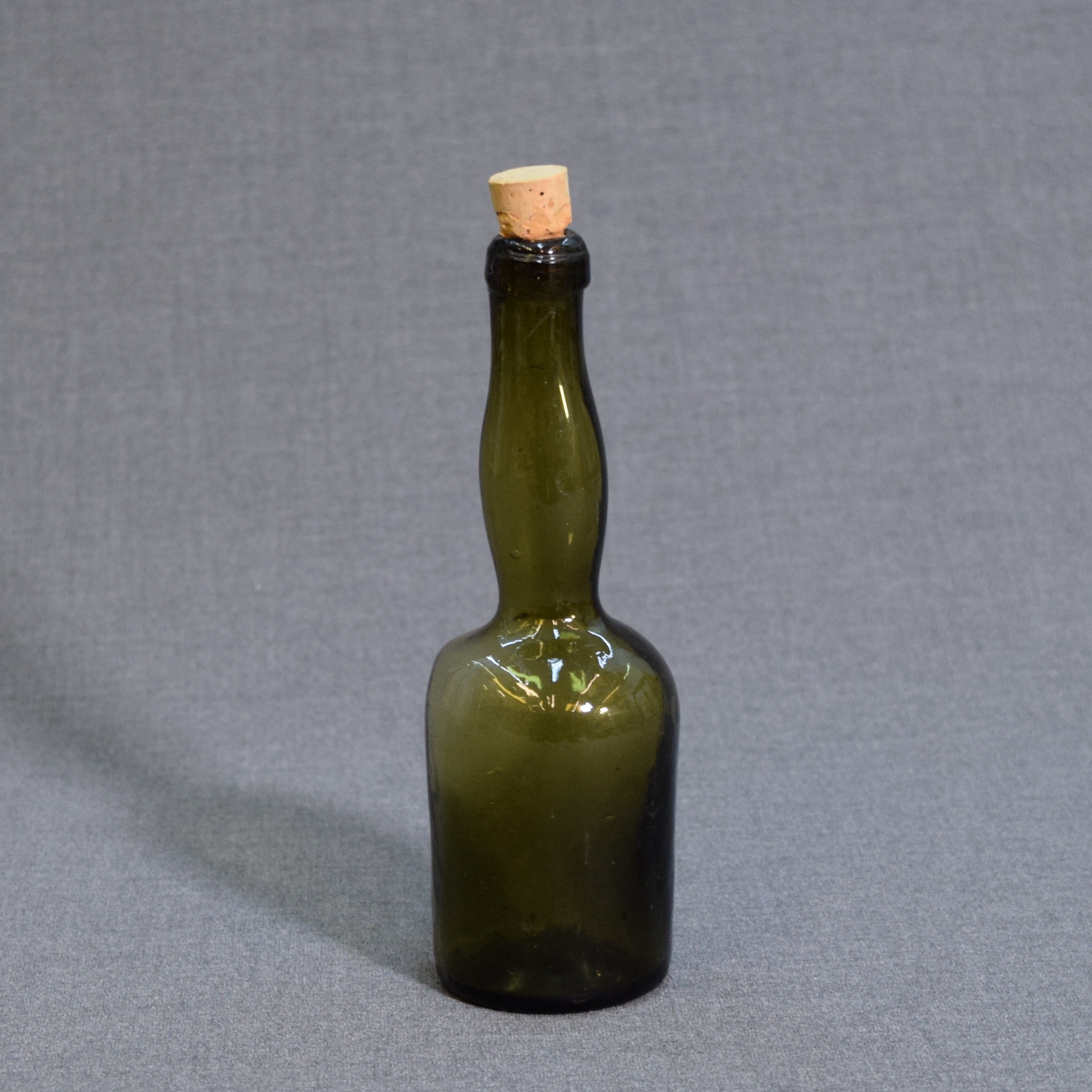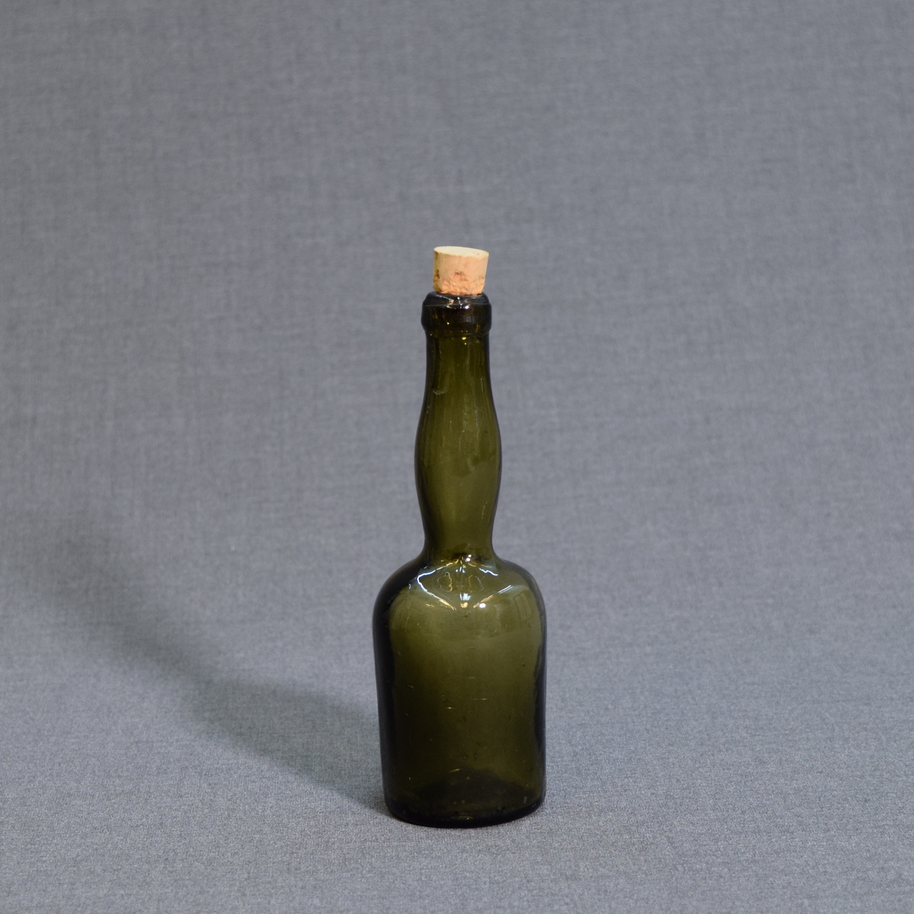 Hand-blown, slightly crooked bottle with a pontil mark on the base. The cork is a modern reproduction, handmade by a craftsman ;)