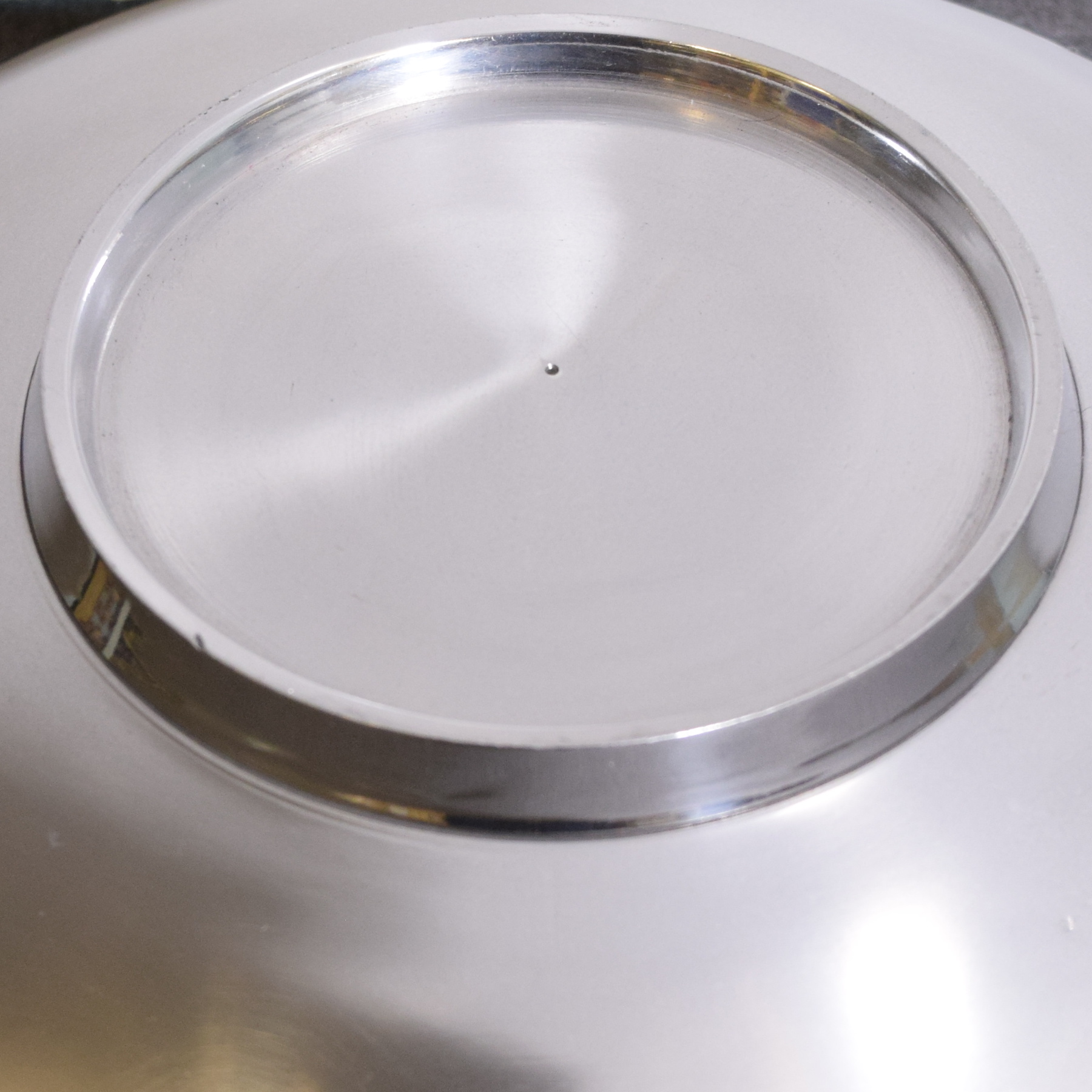 Glossy, mirror-like exterior that is not magnetic. Interior is enameled.