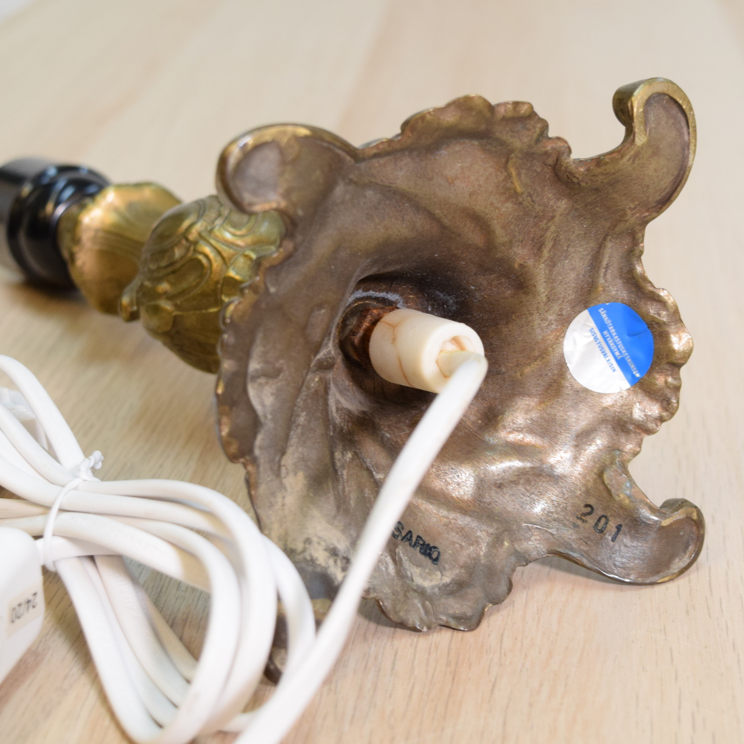 Pohjassa lukee "SARIO", "201" ja "Sähkötarkastuskeskuksen hyväksymä sisustusvalaisin".