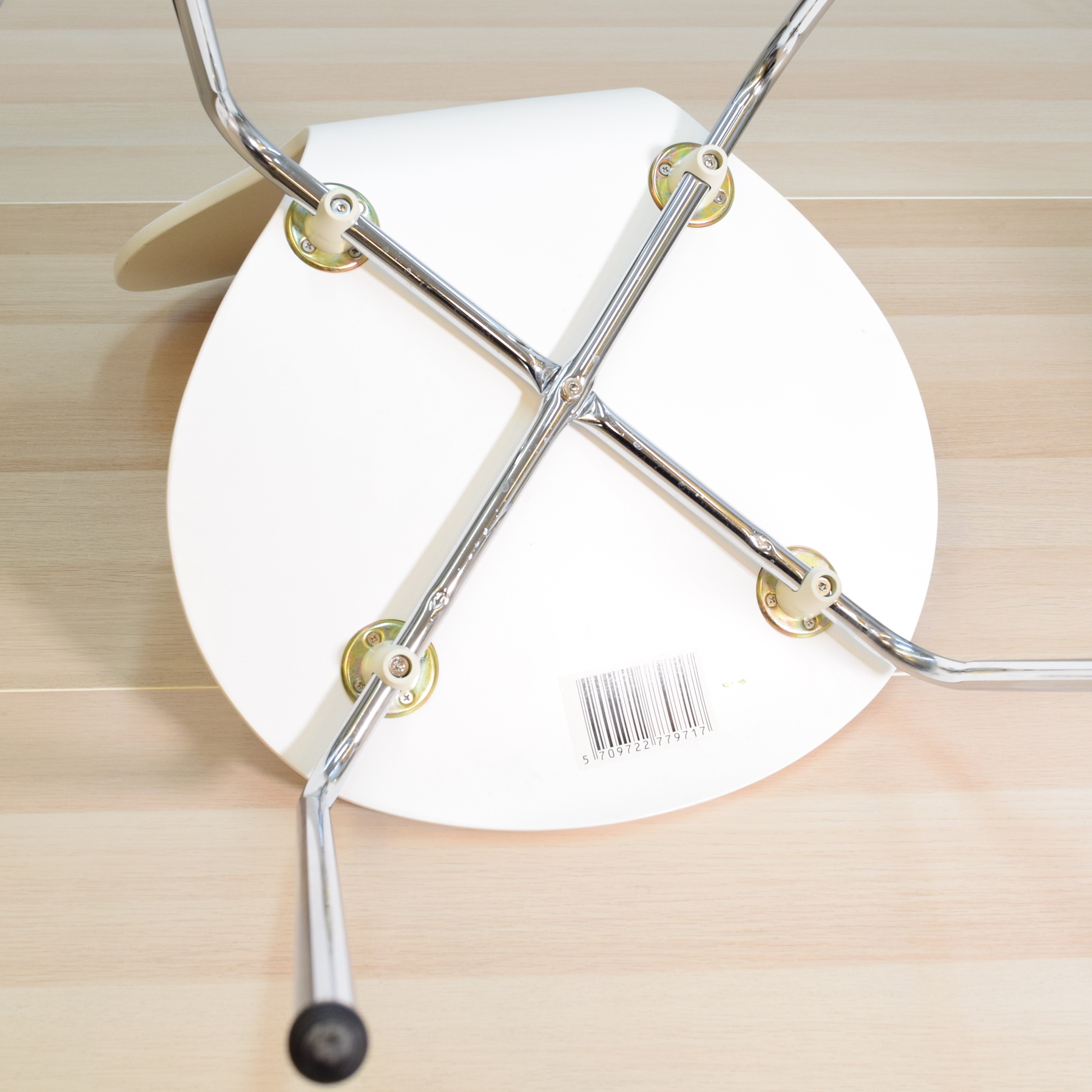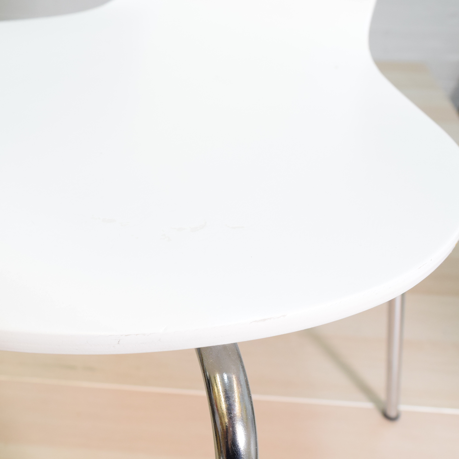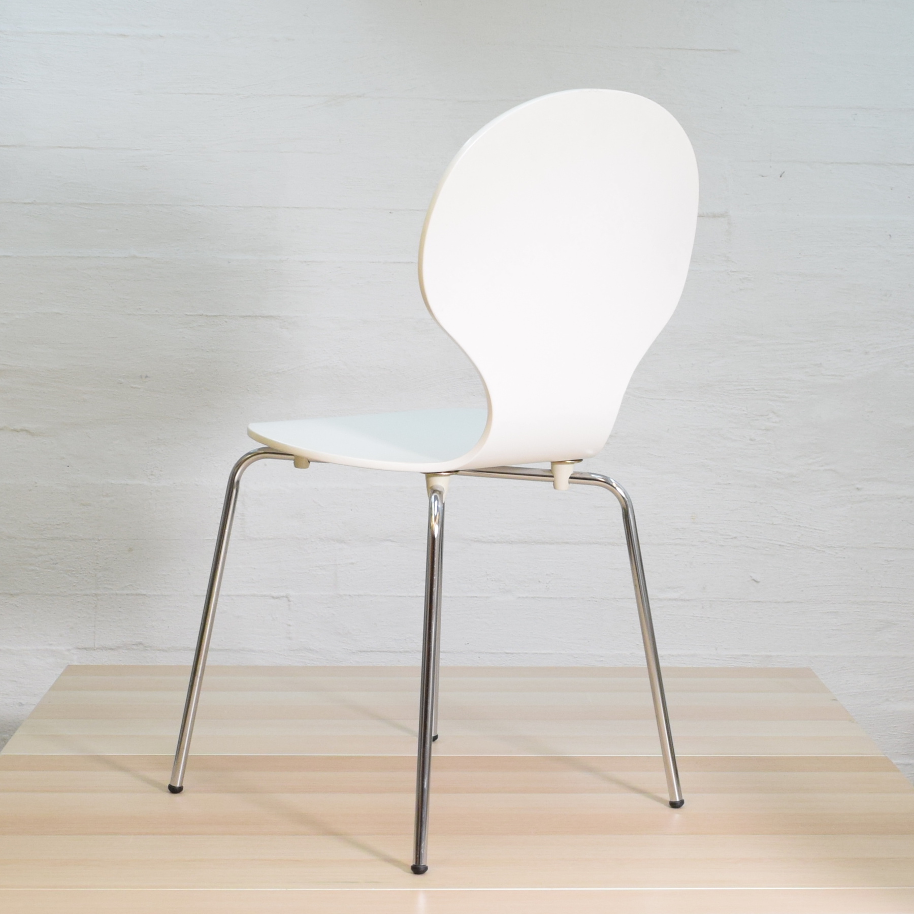 Taitettua maalattua vaneria ja kromijalat.