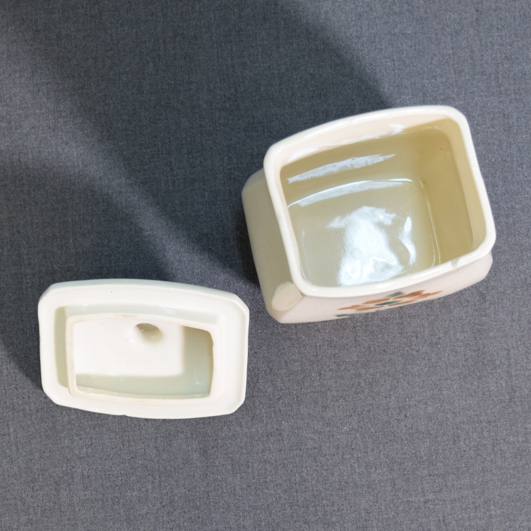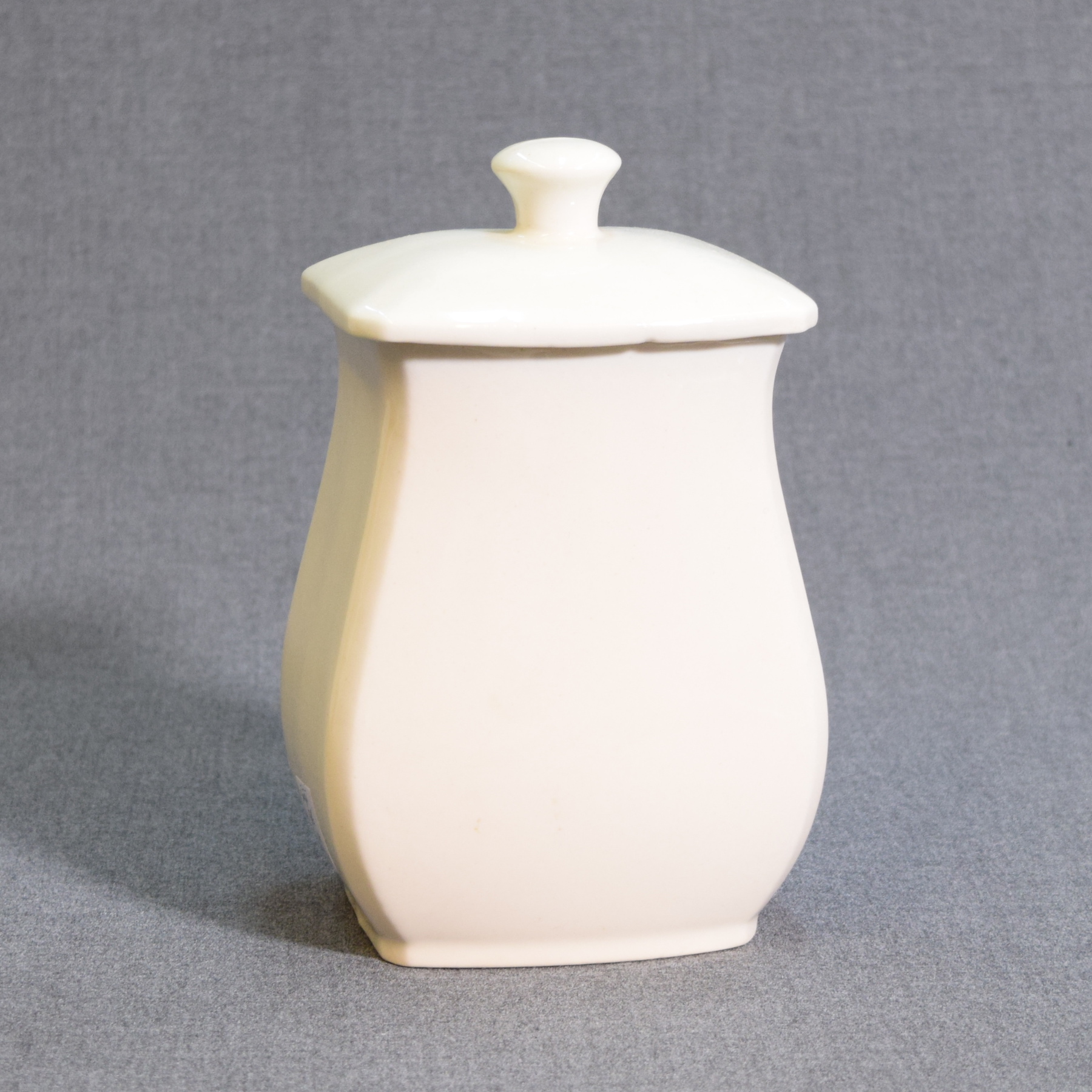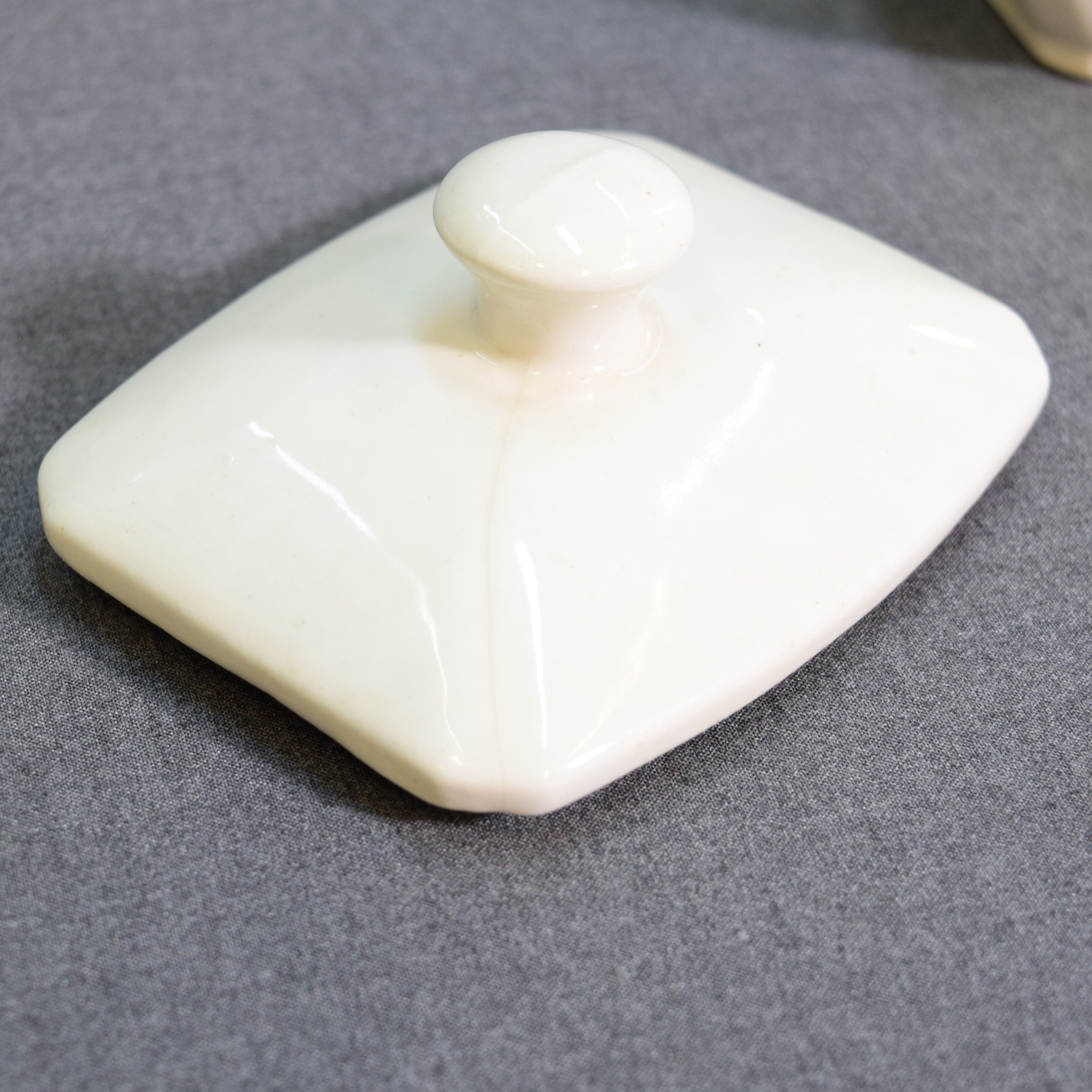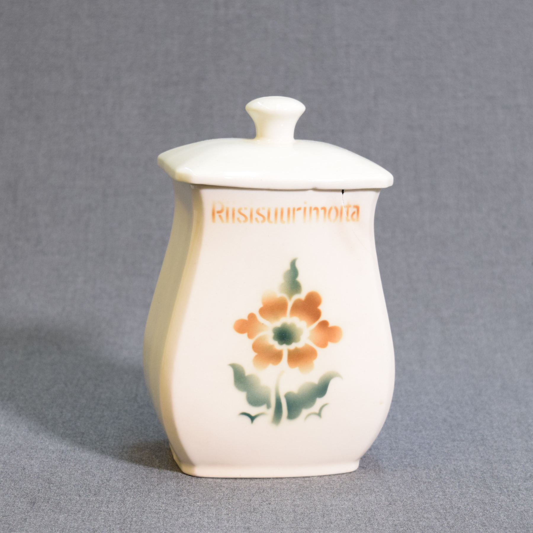 There is a chip and a crack on the front of the jar. The glaze on the lid has a visible surface line.