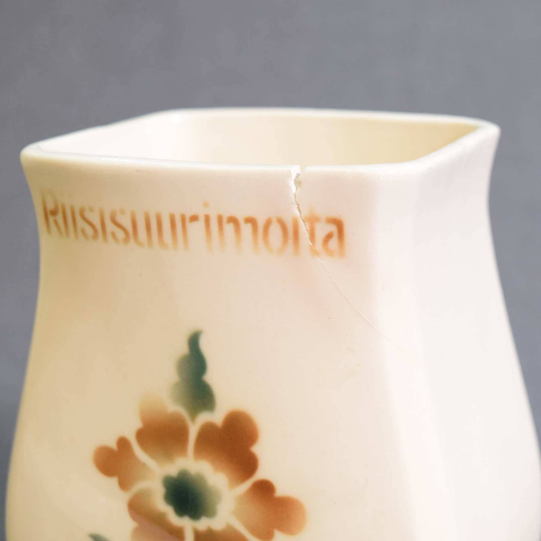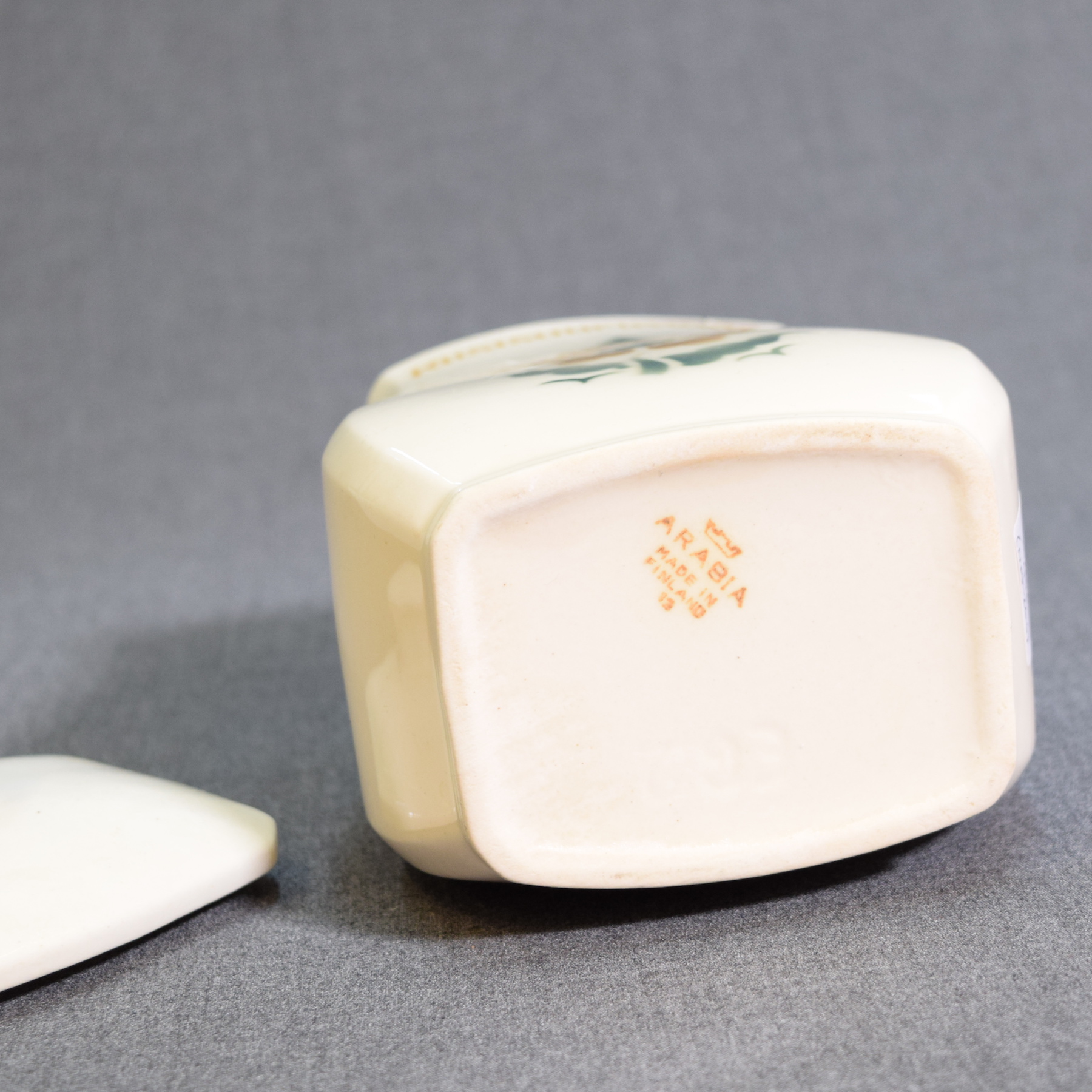 Features a brown floral decoration and a brown Arabia stamp.