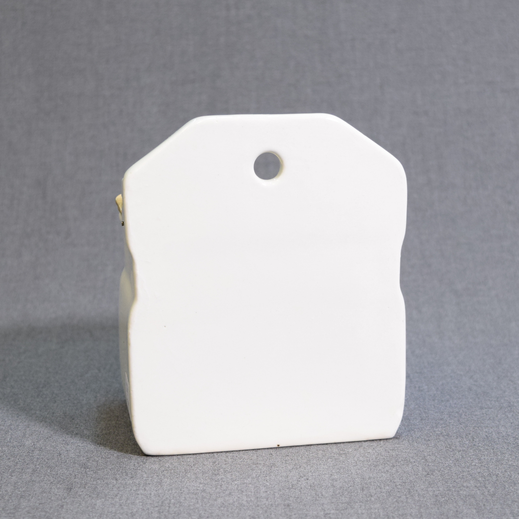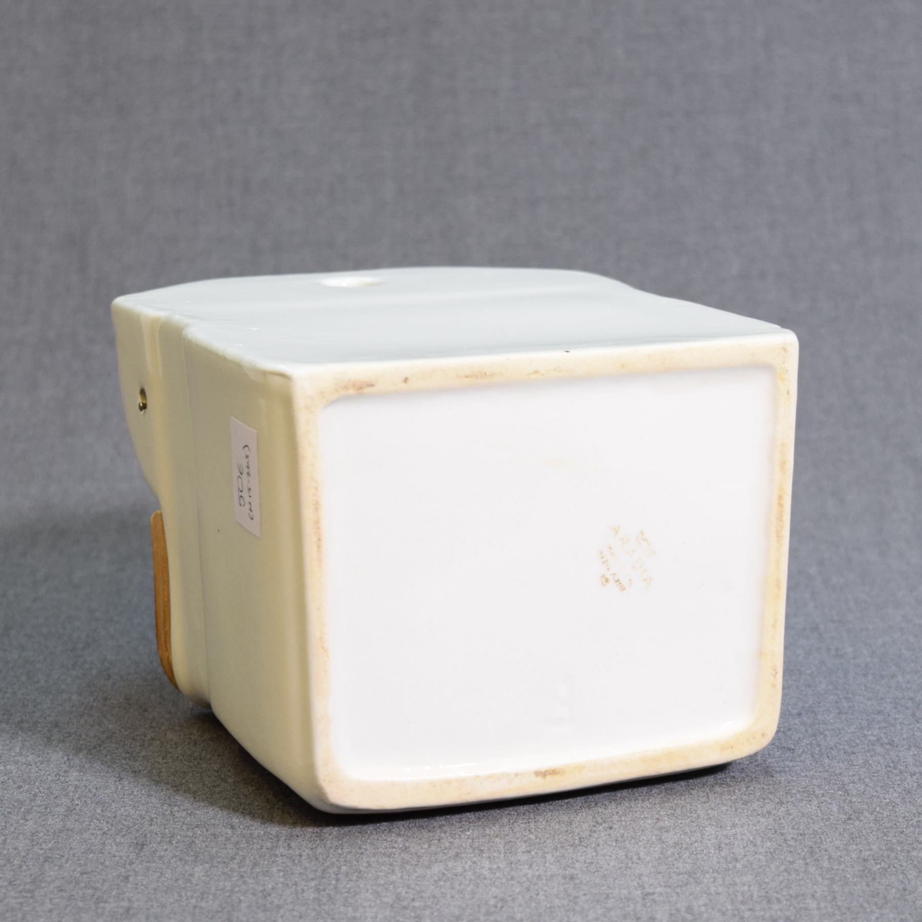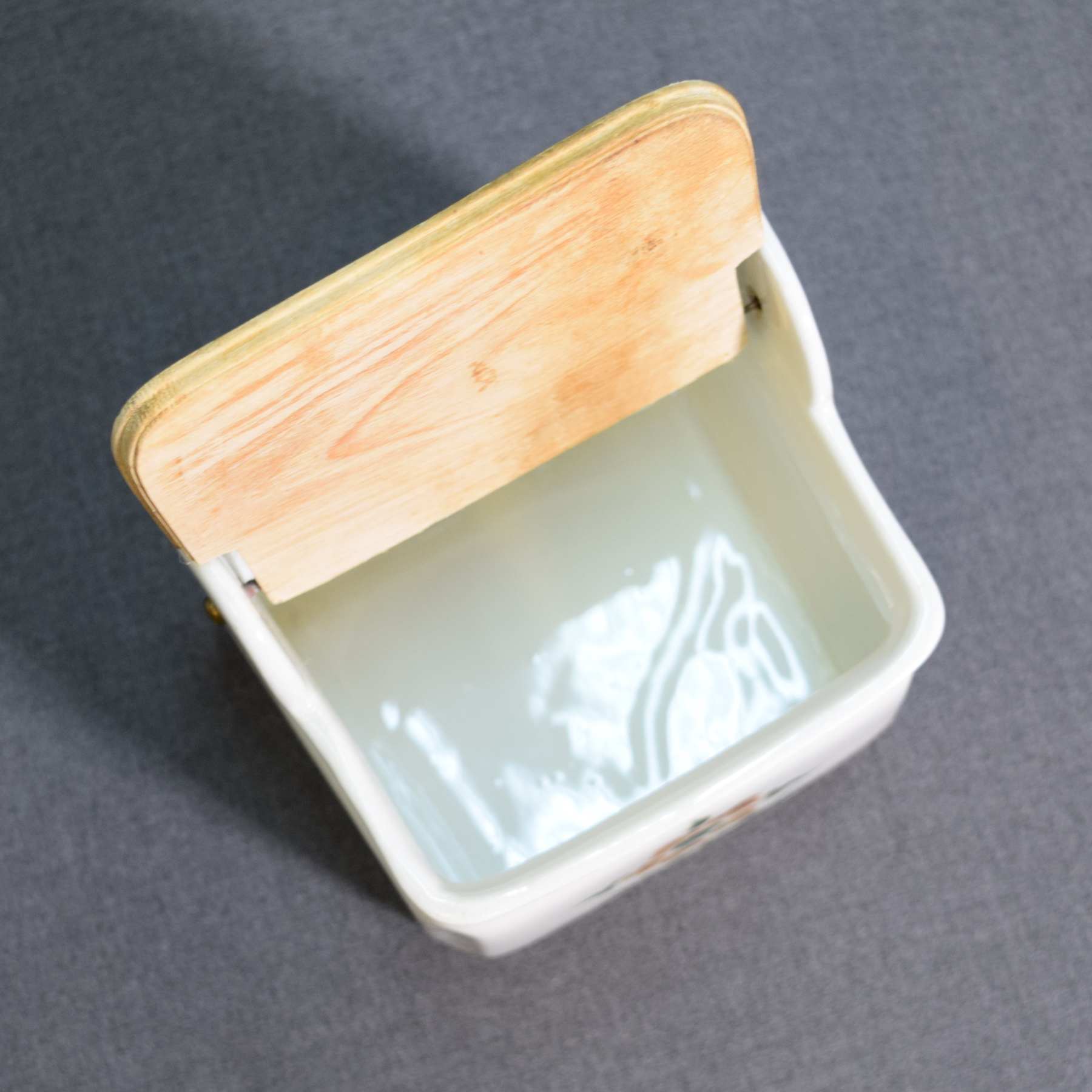 In tidy condition. The lid has been repaired (using a nail and screw as hinges), and there is a hairline crack in the glaze on the back right corner.