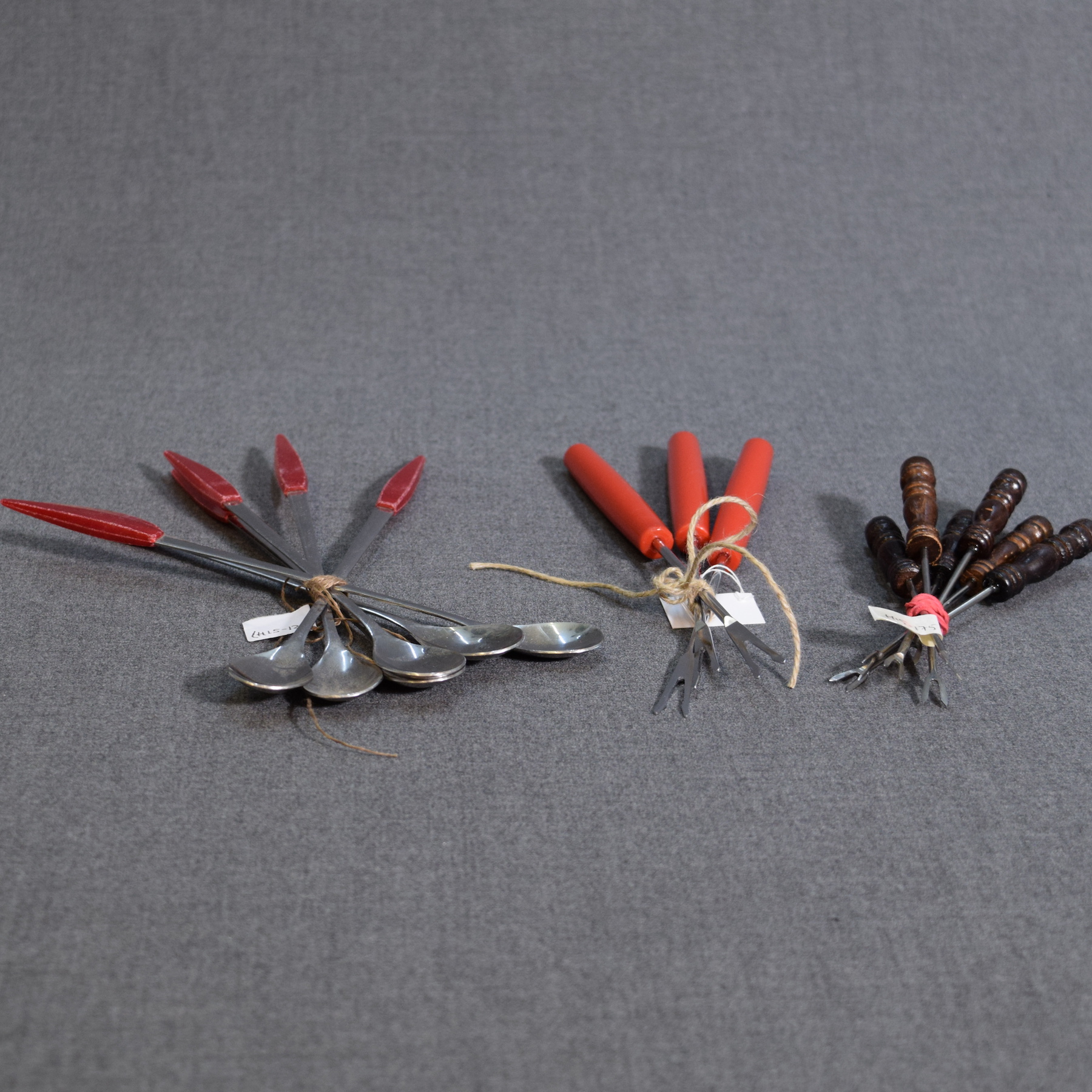 Vanhoja ja osin kuluneita ruokailuvälineitä.