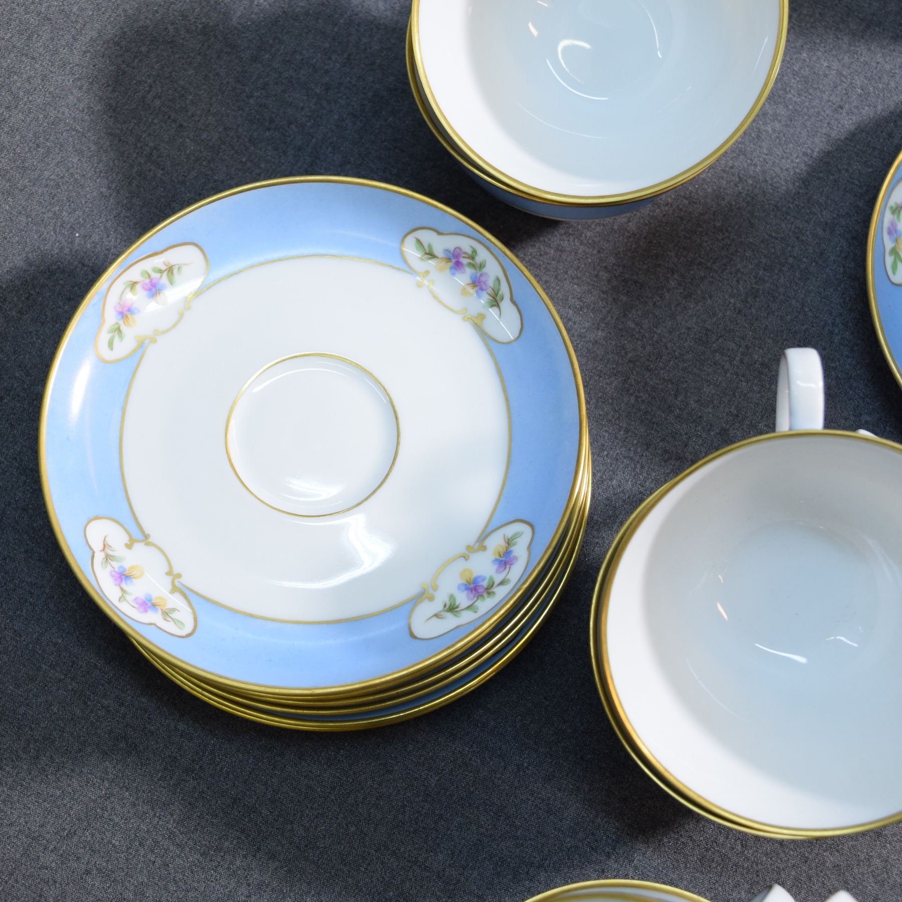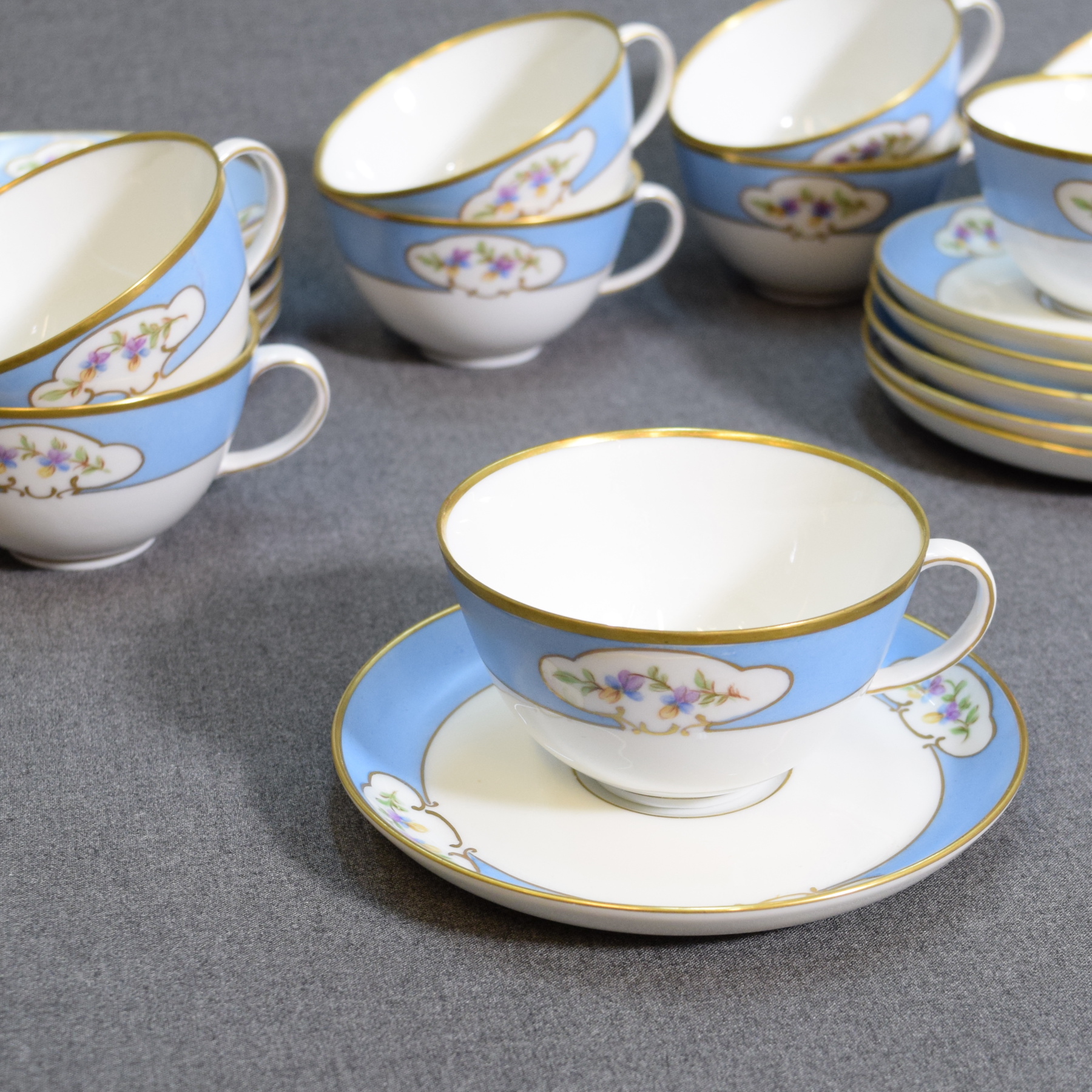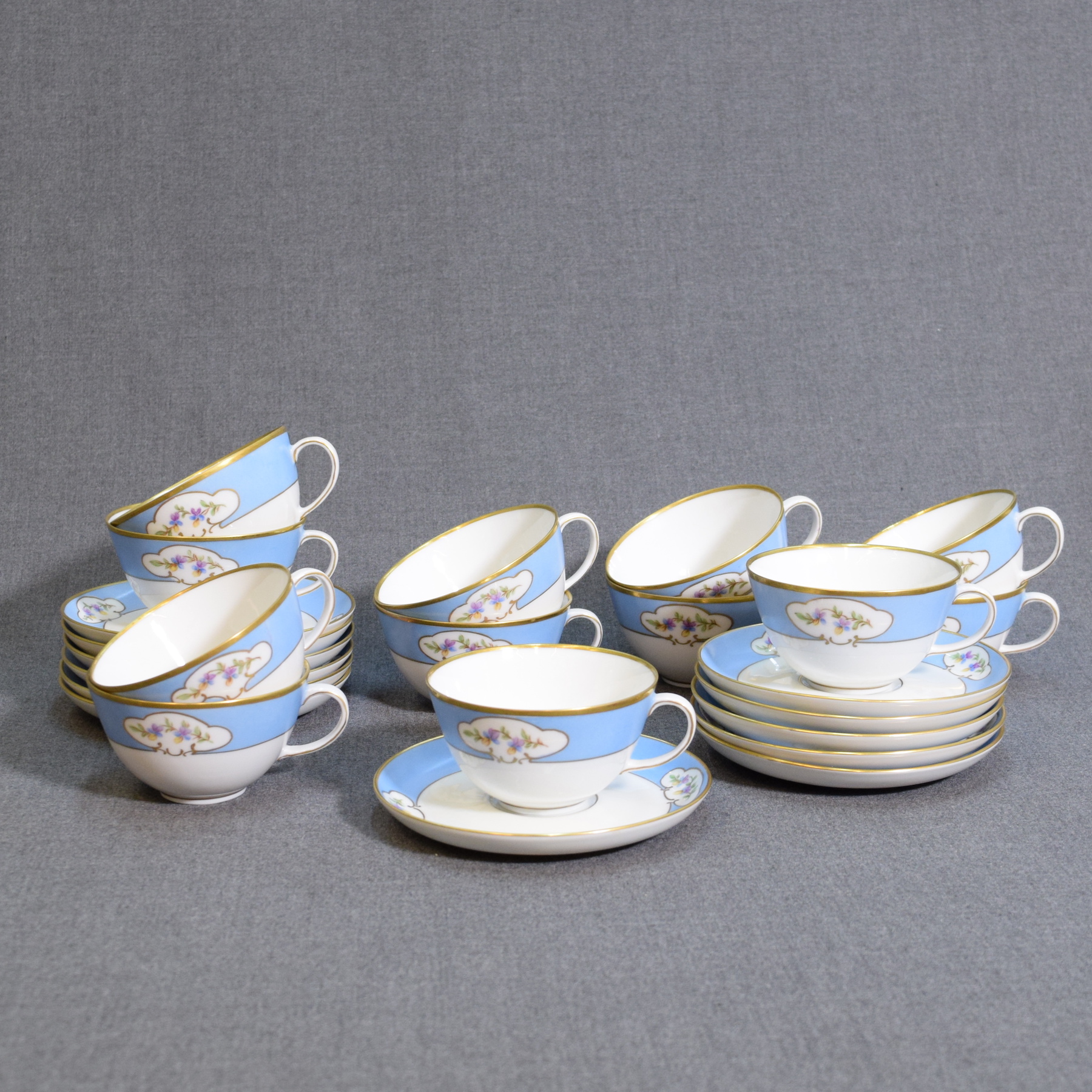 Kukkakuvioituja vaaleansinisiä ja kullanvärisillä reunoilla koreisteltuja posliiniastioita.