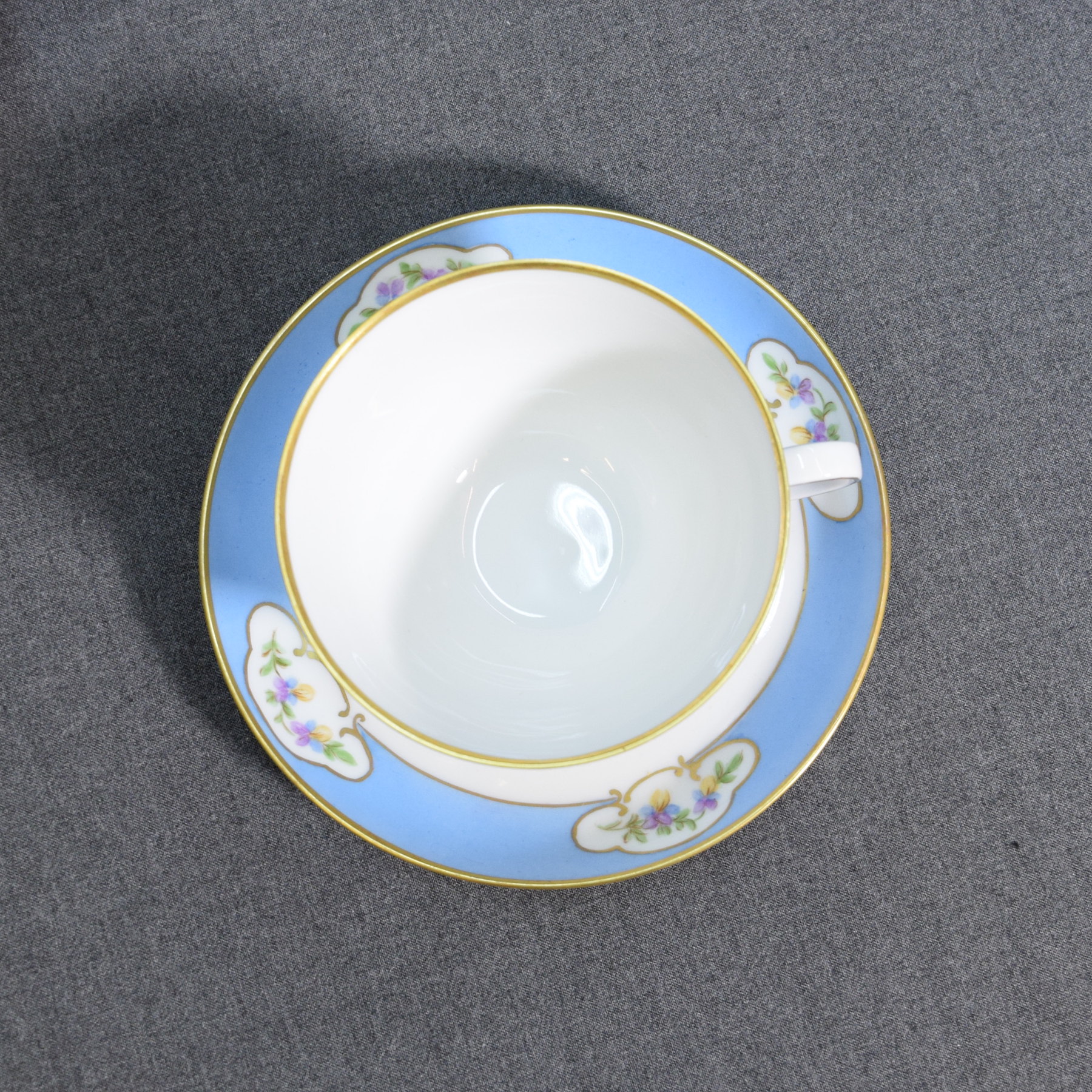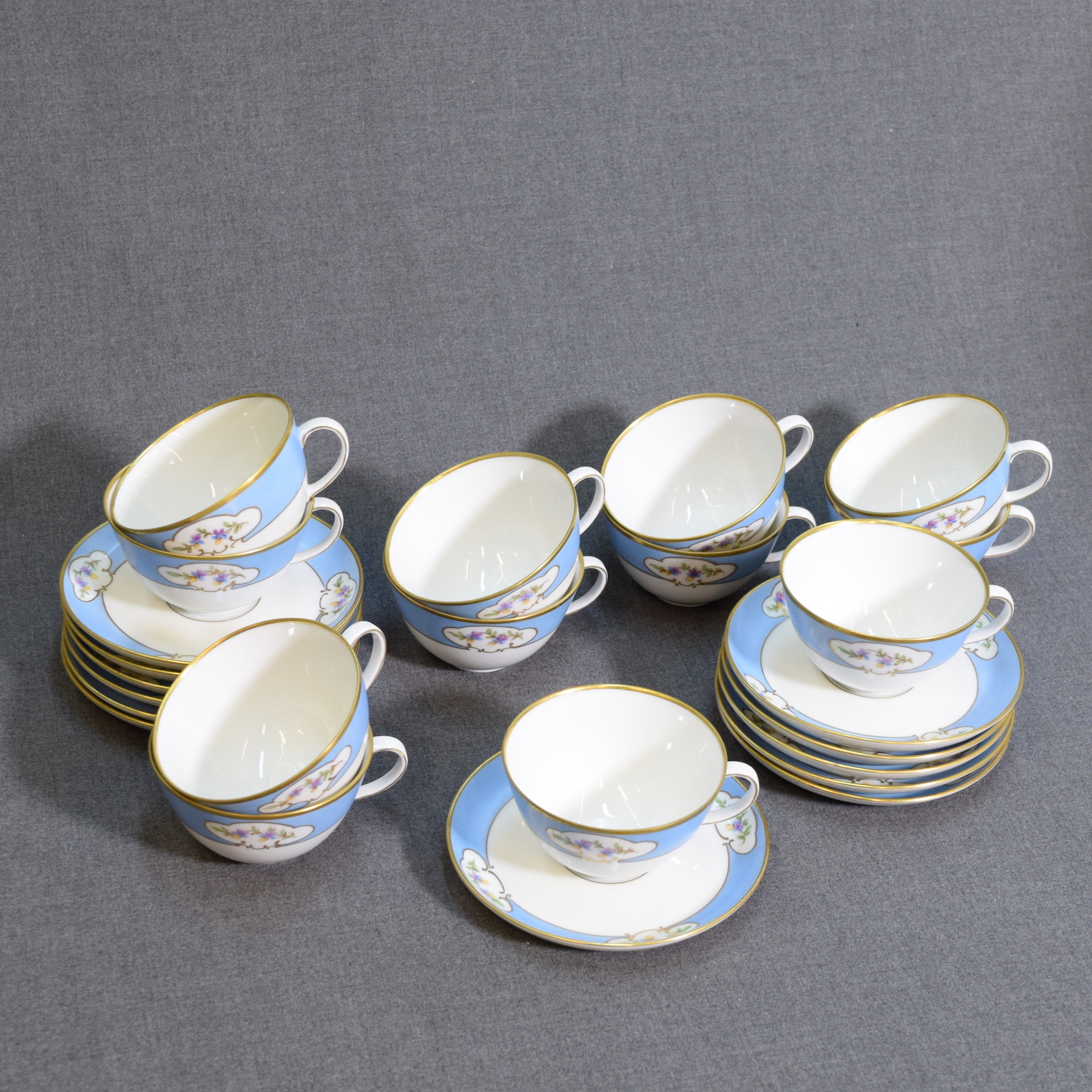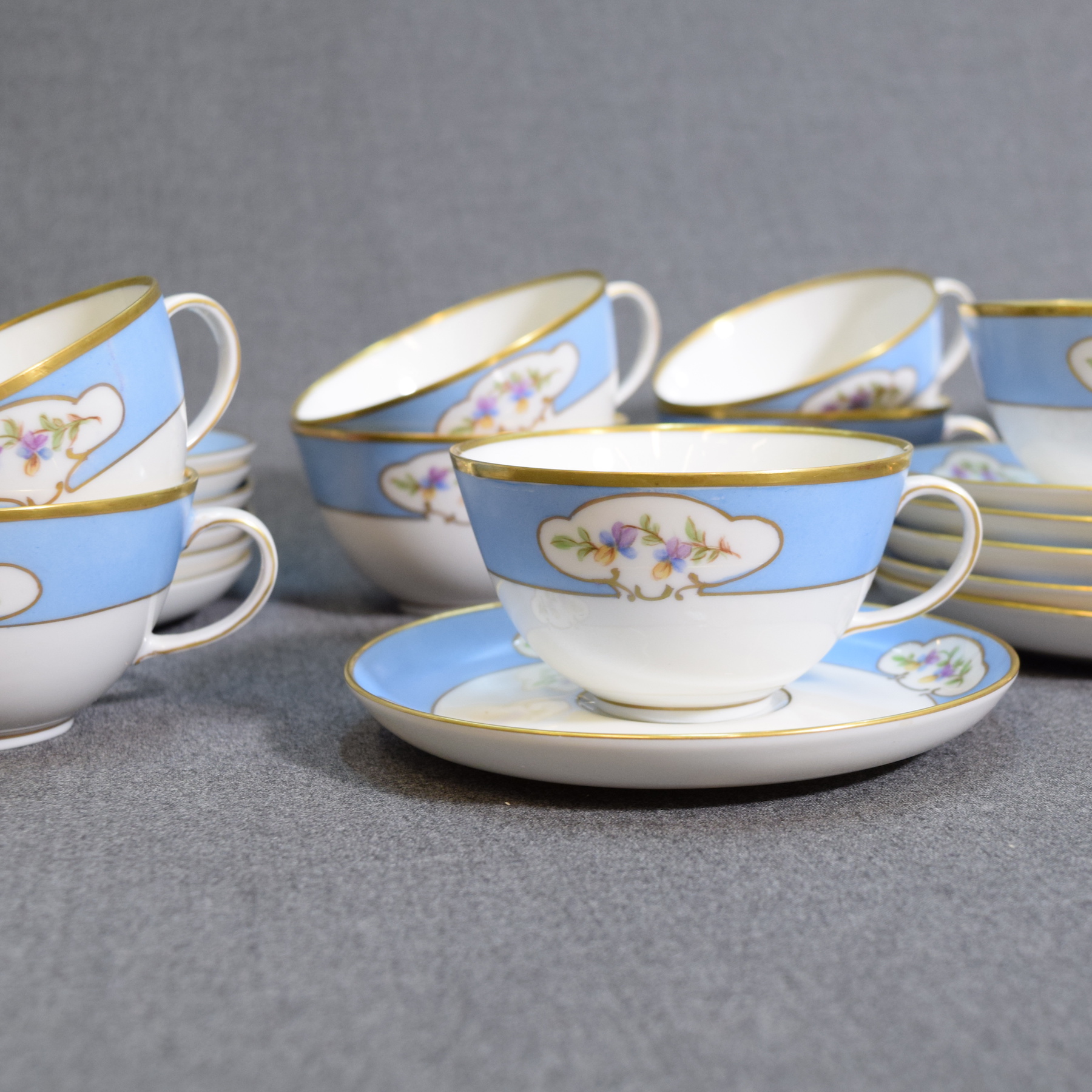 Kukkakuvioituja vaaleansinisiä ja kullanvärisillä reunoilla koreisteltuja posliiniastioita.