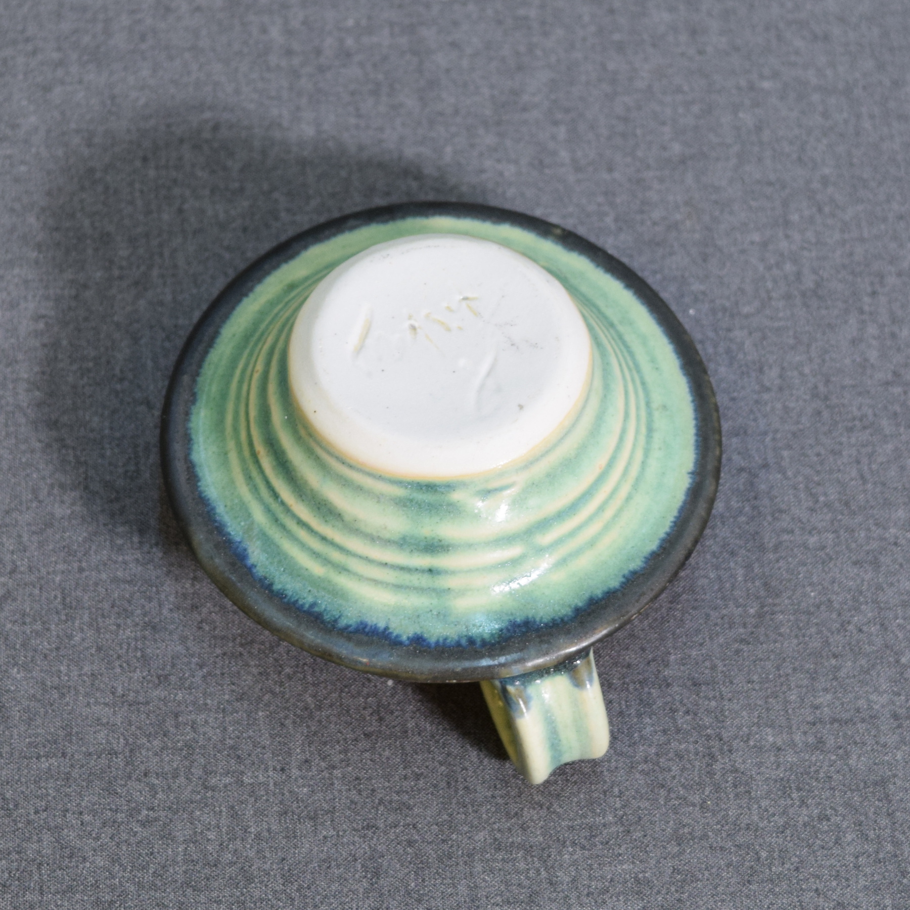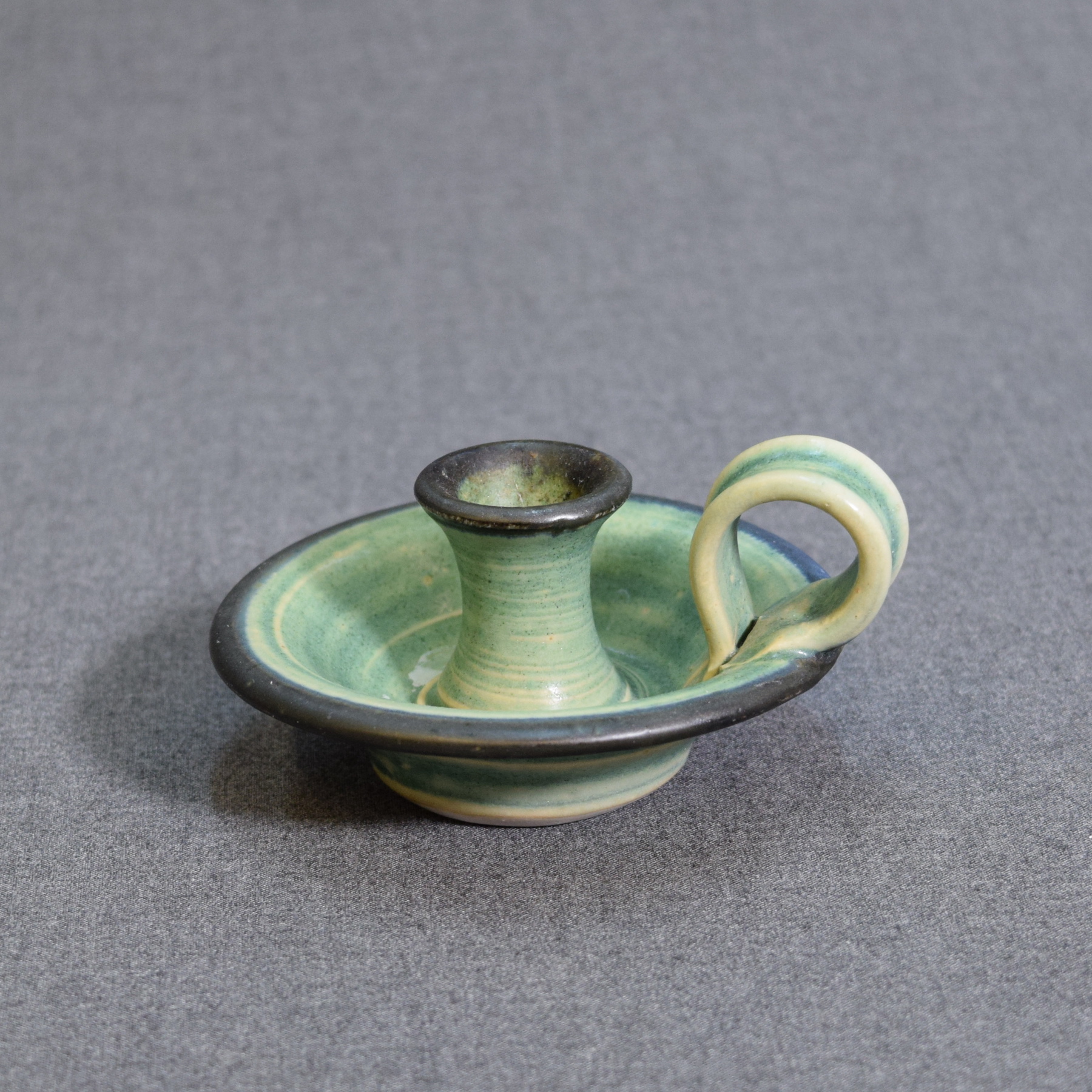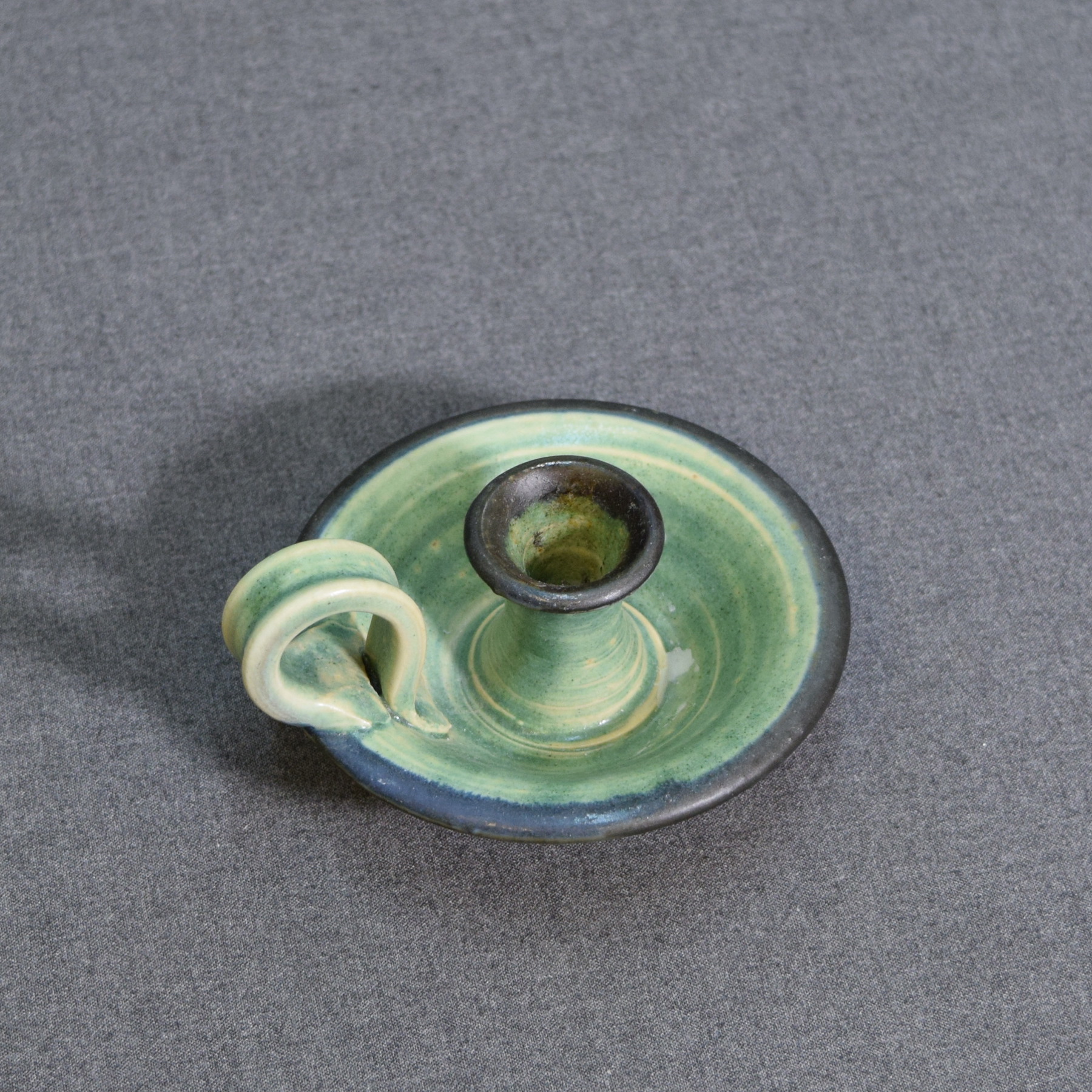 Vihreällä ja mustalla lasitettu kynttilänjalka.