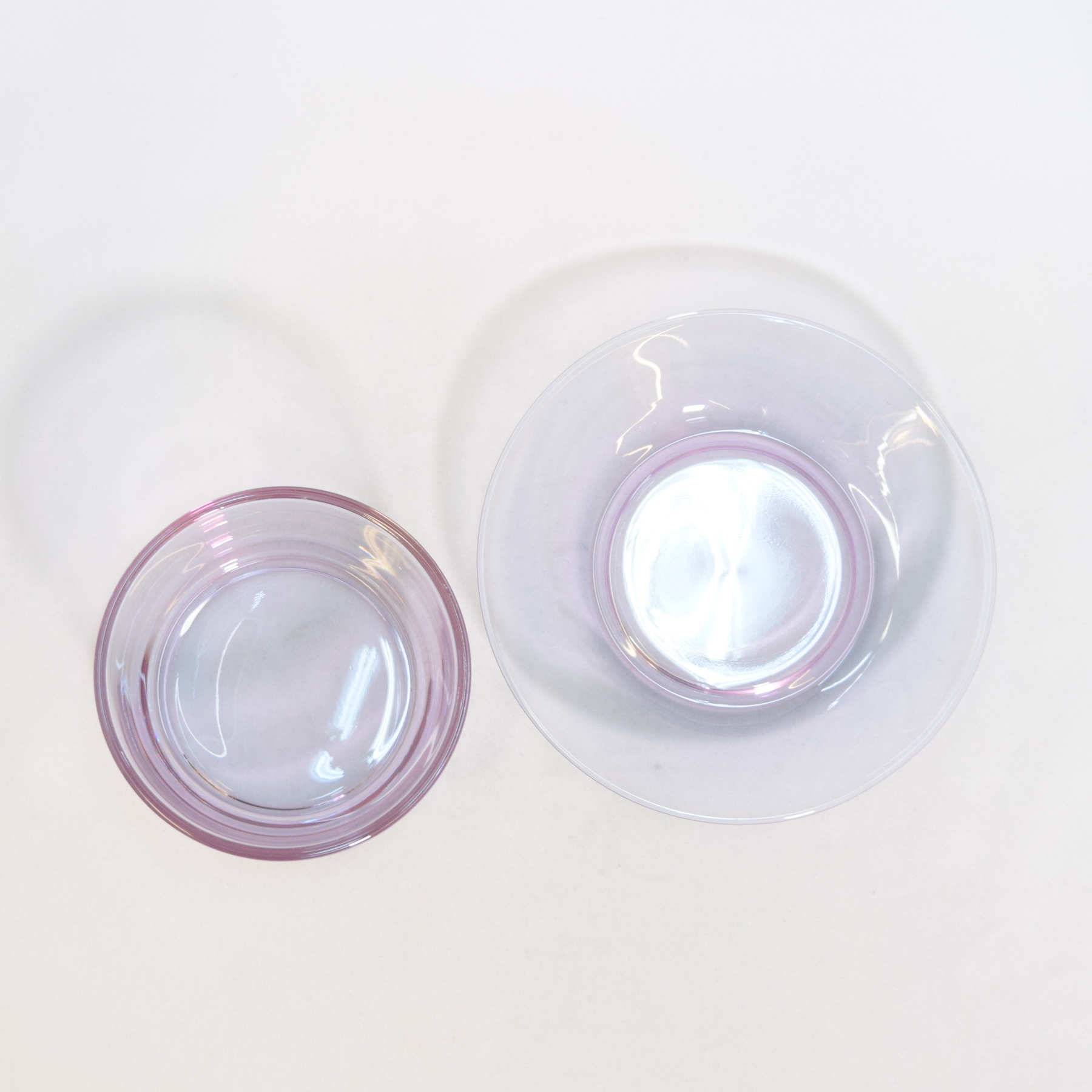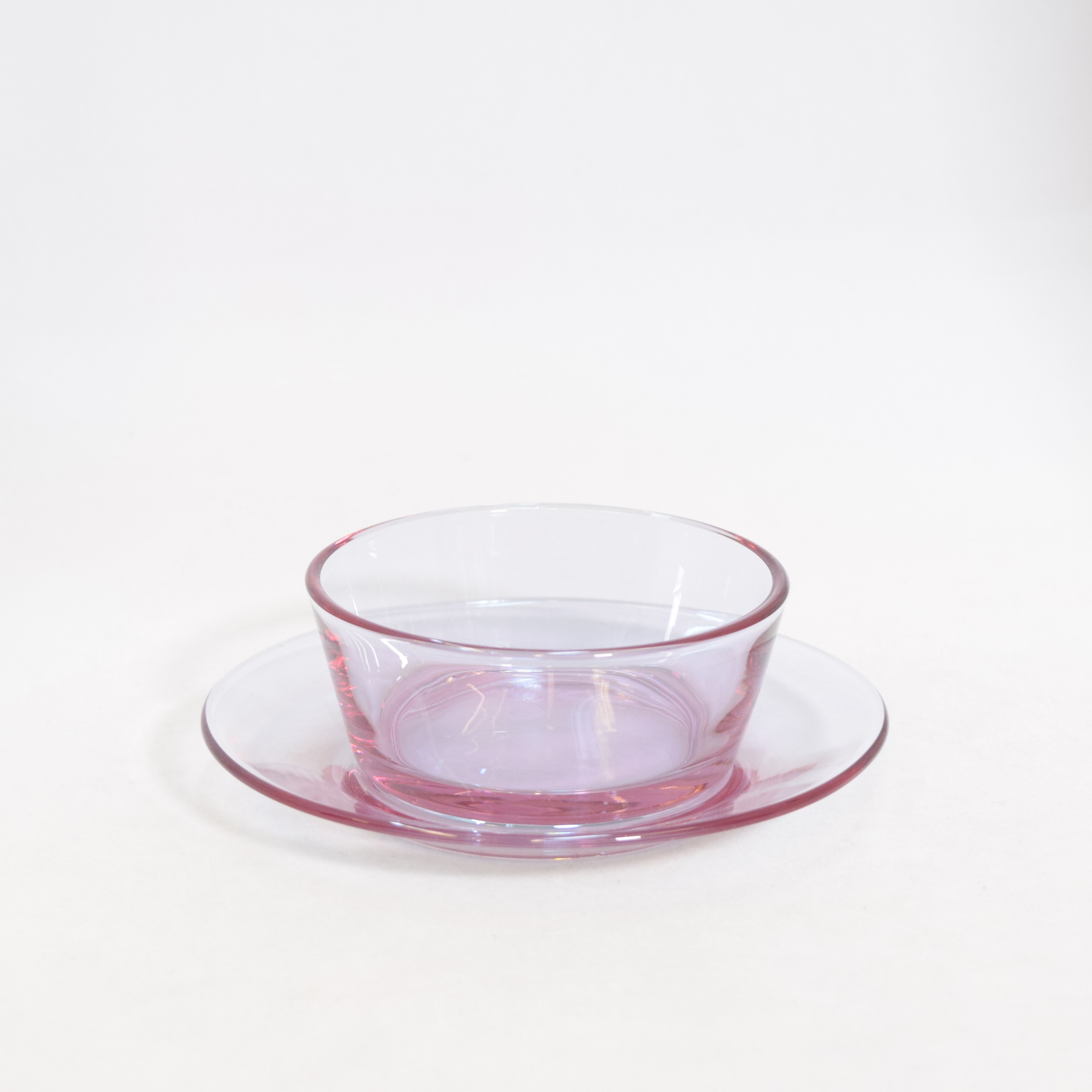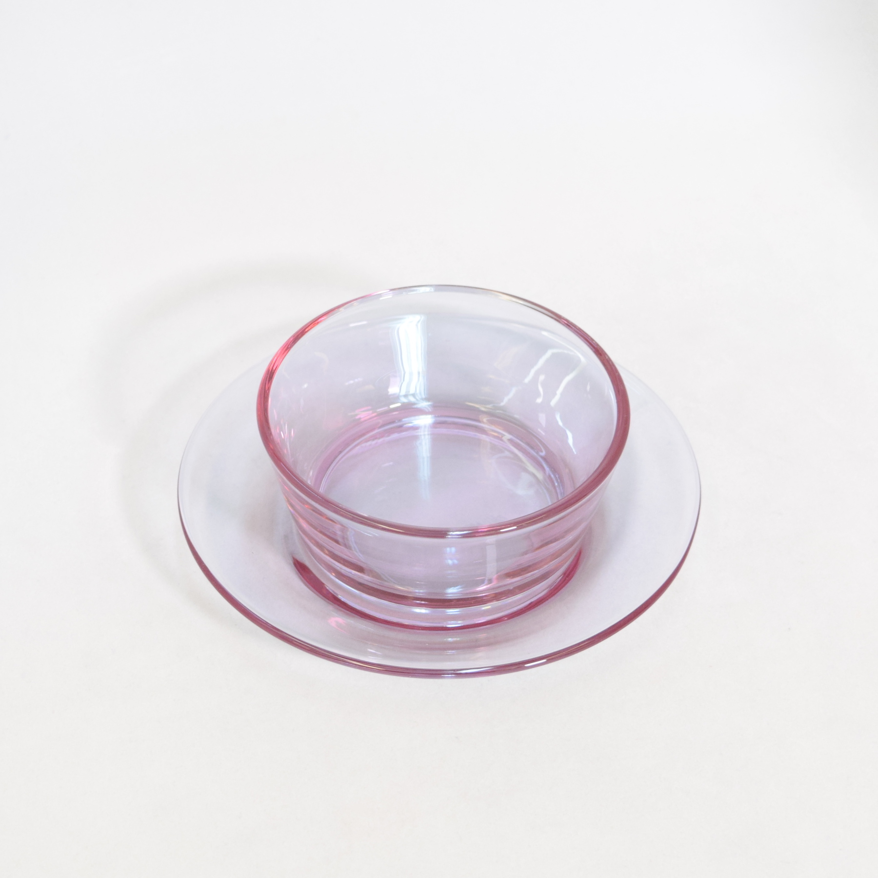 Kaunis lilanvärinen Kartio jälkiruokamalja ja aluslautanen.