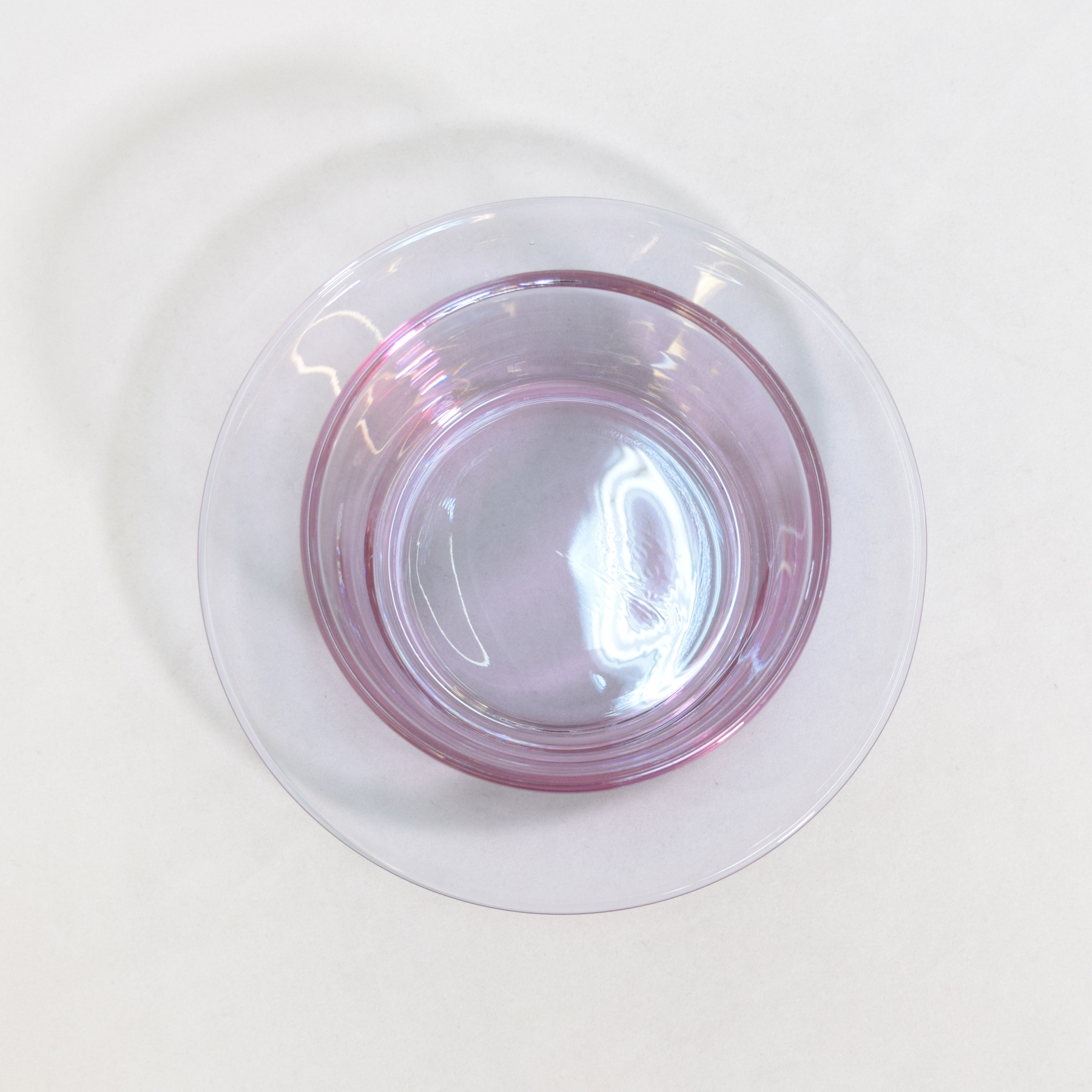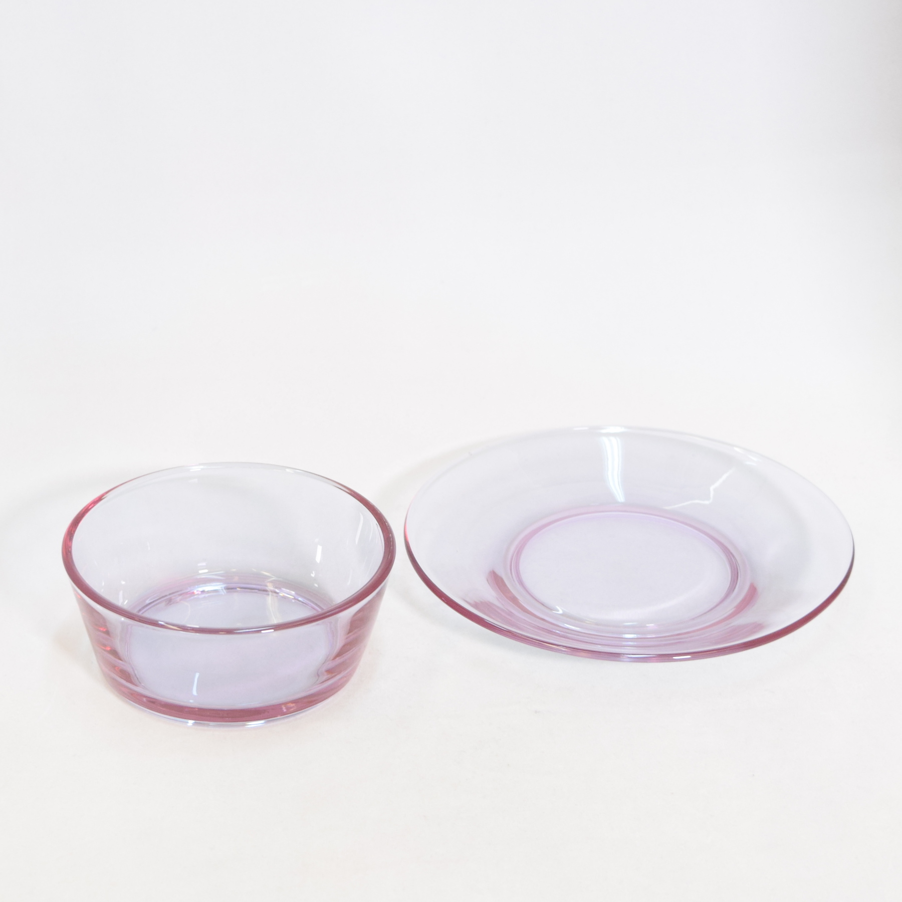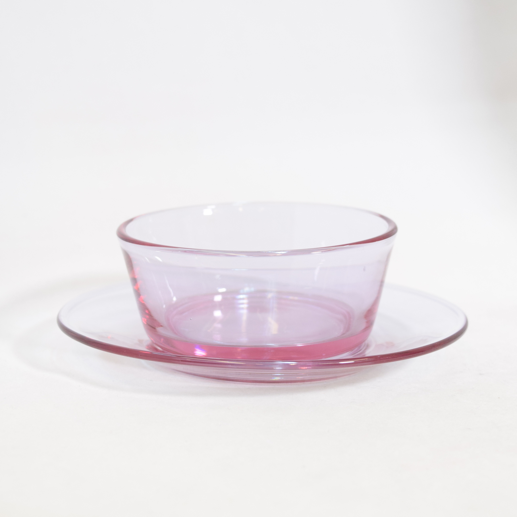 Kaunis lilanvärinen Kartio jälkiruokamalja ja aluslautanen.