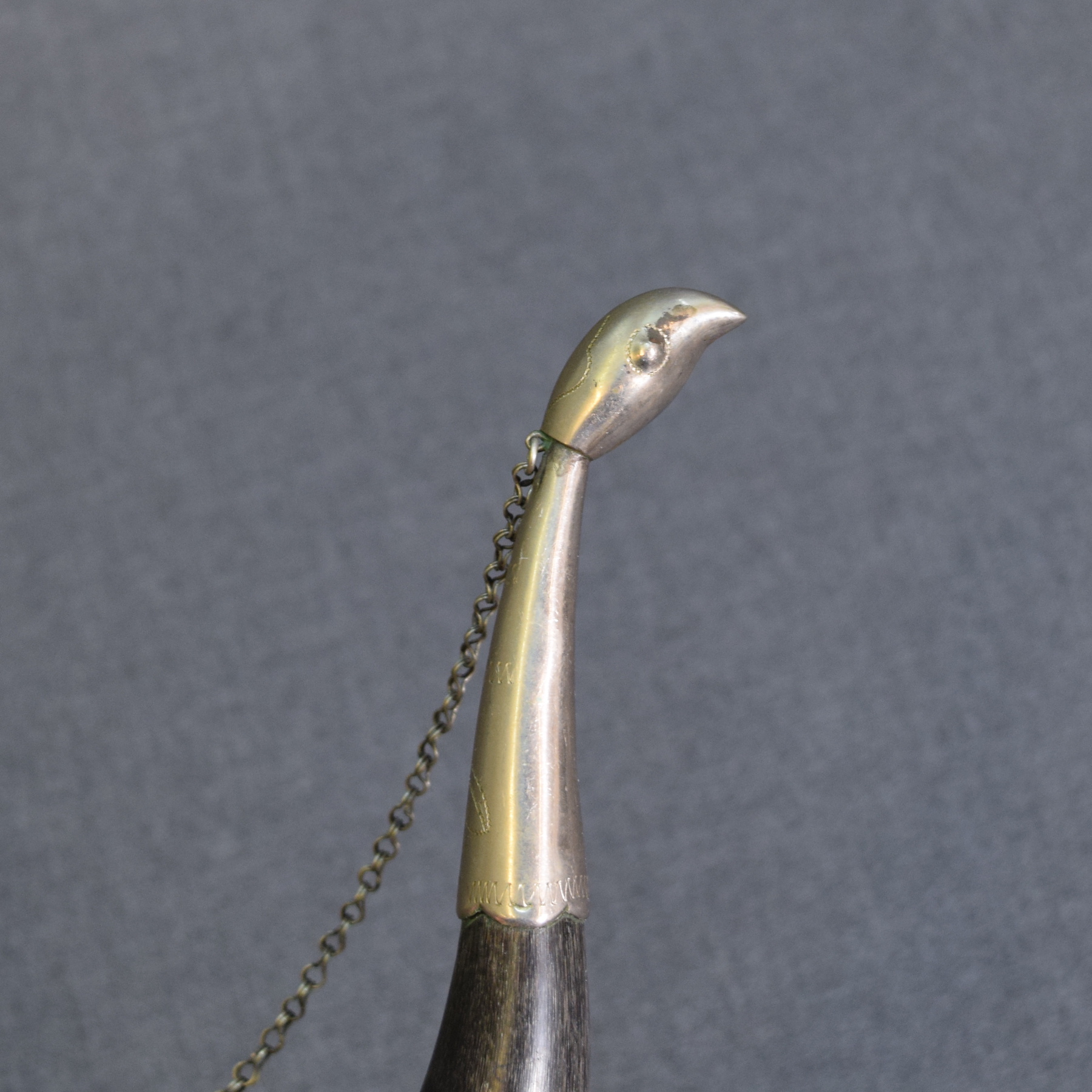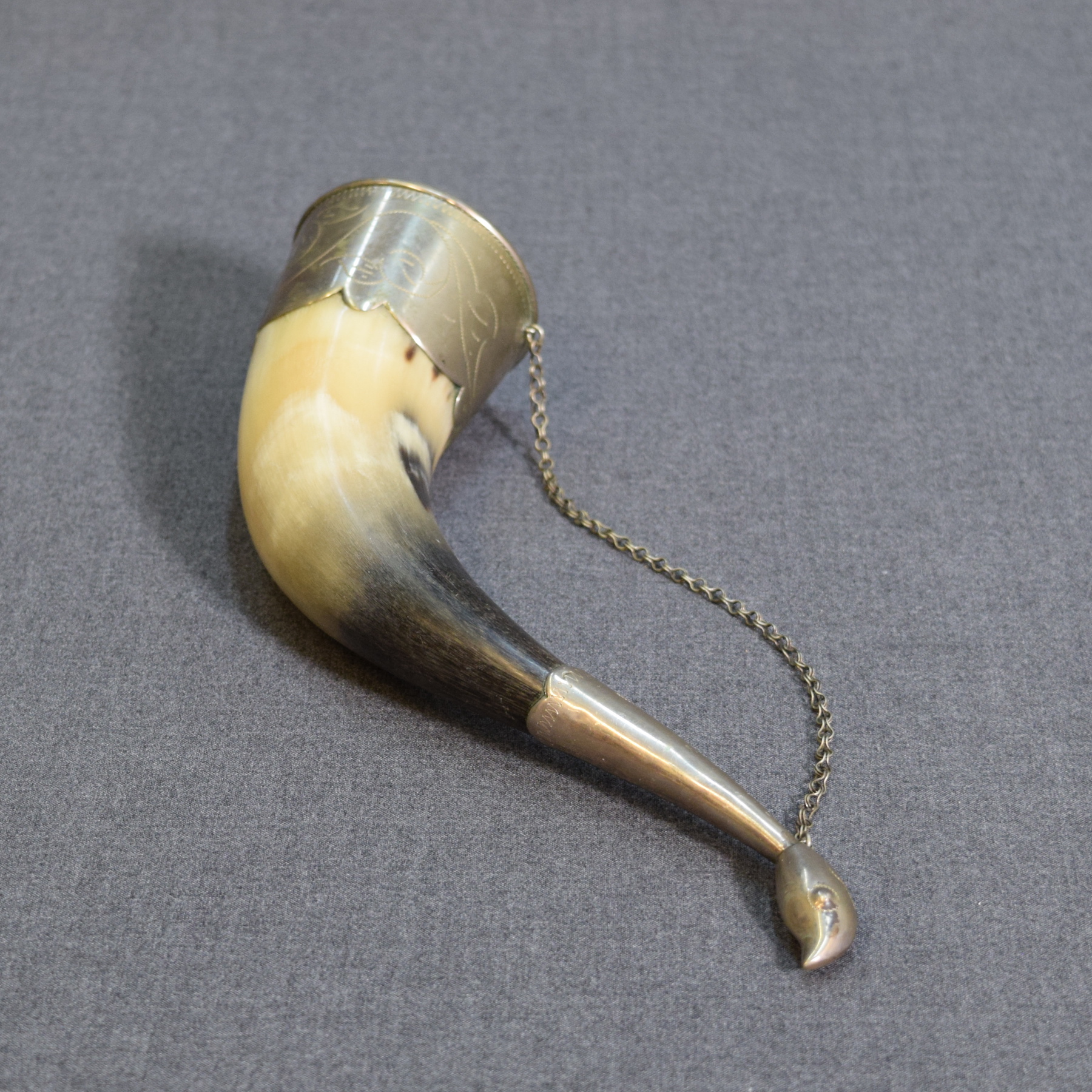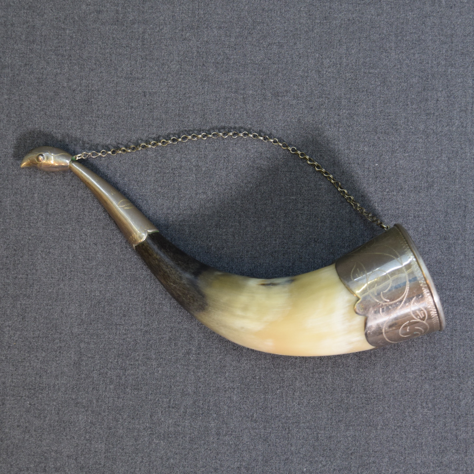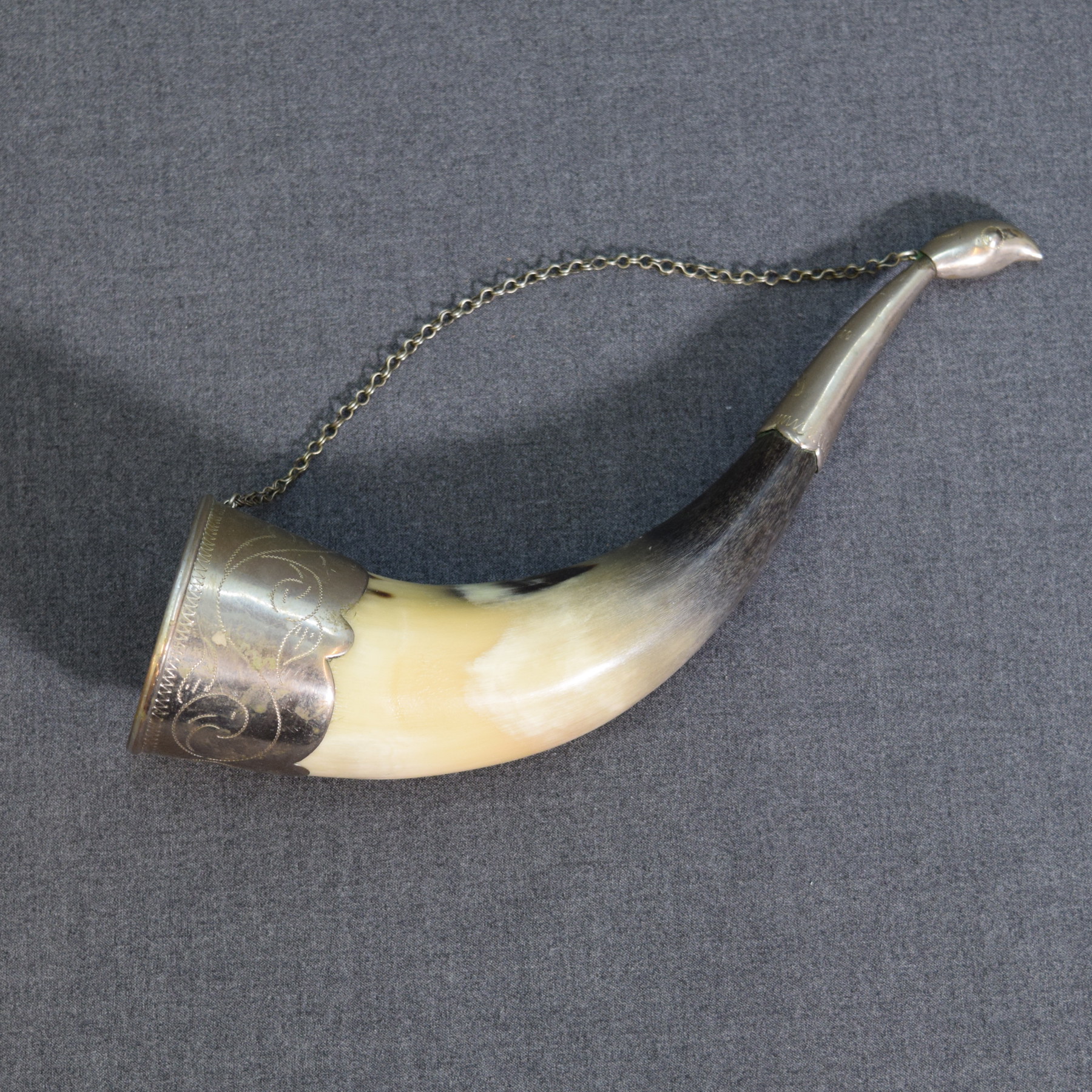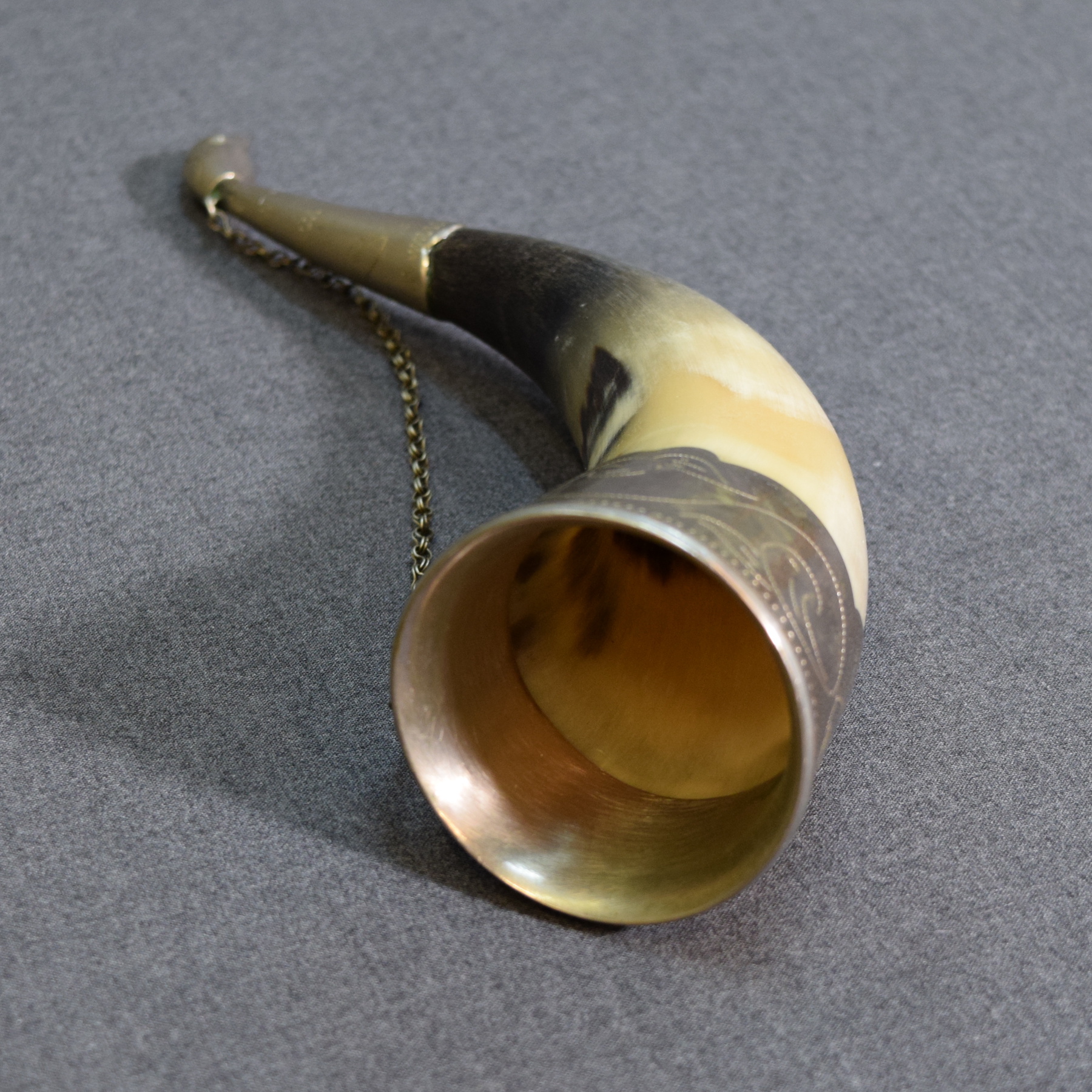 Vintage Russian decorative horn with metal ornaments.